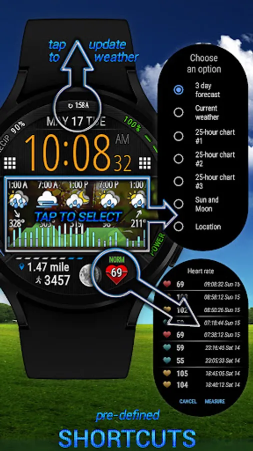 • This watch face independently measures your heart rate. This watch face does not receive data from built-in Wear OS heart rate apps.