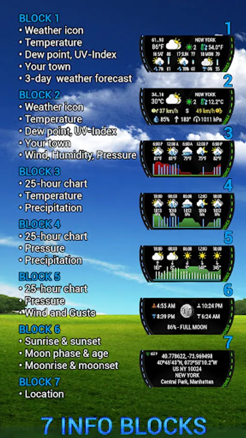 The information block in the middle can be displayed in 7 modes (3-day forecast, current weather, 3 types of 25-hour weather charts, sun and moon info, current location).