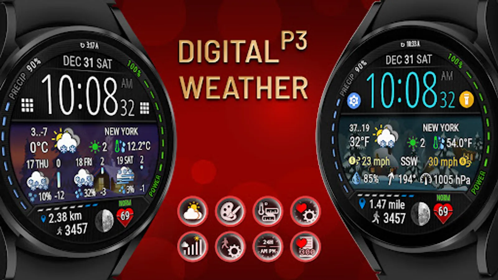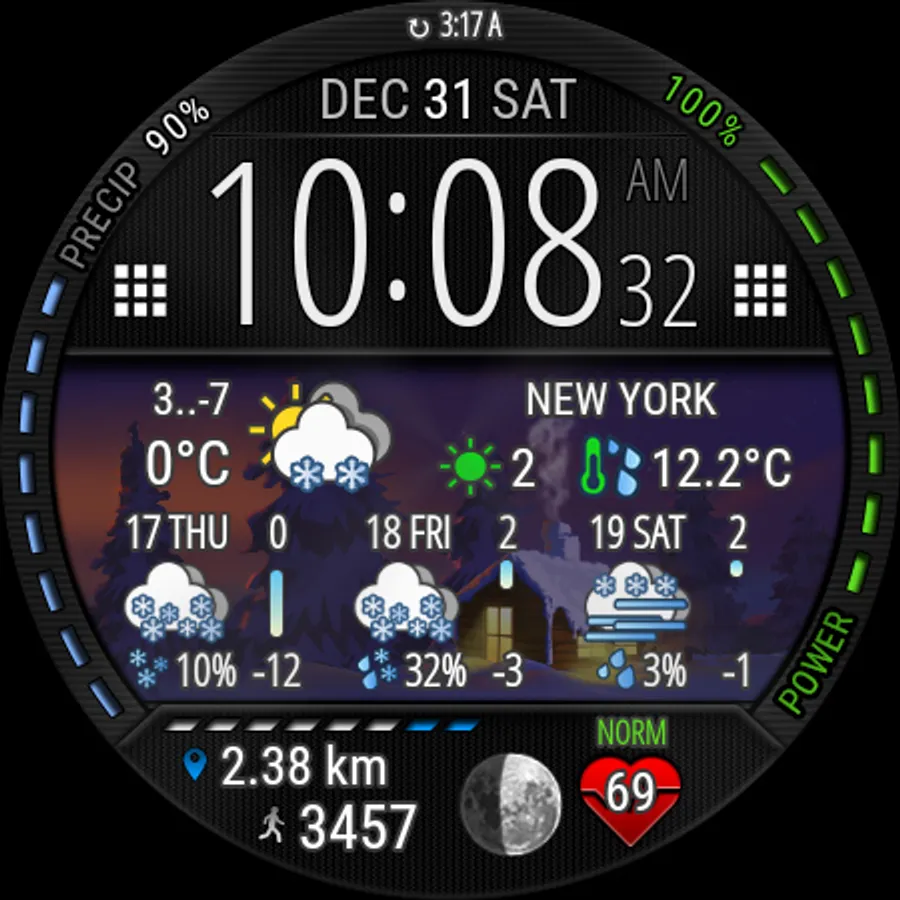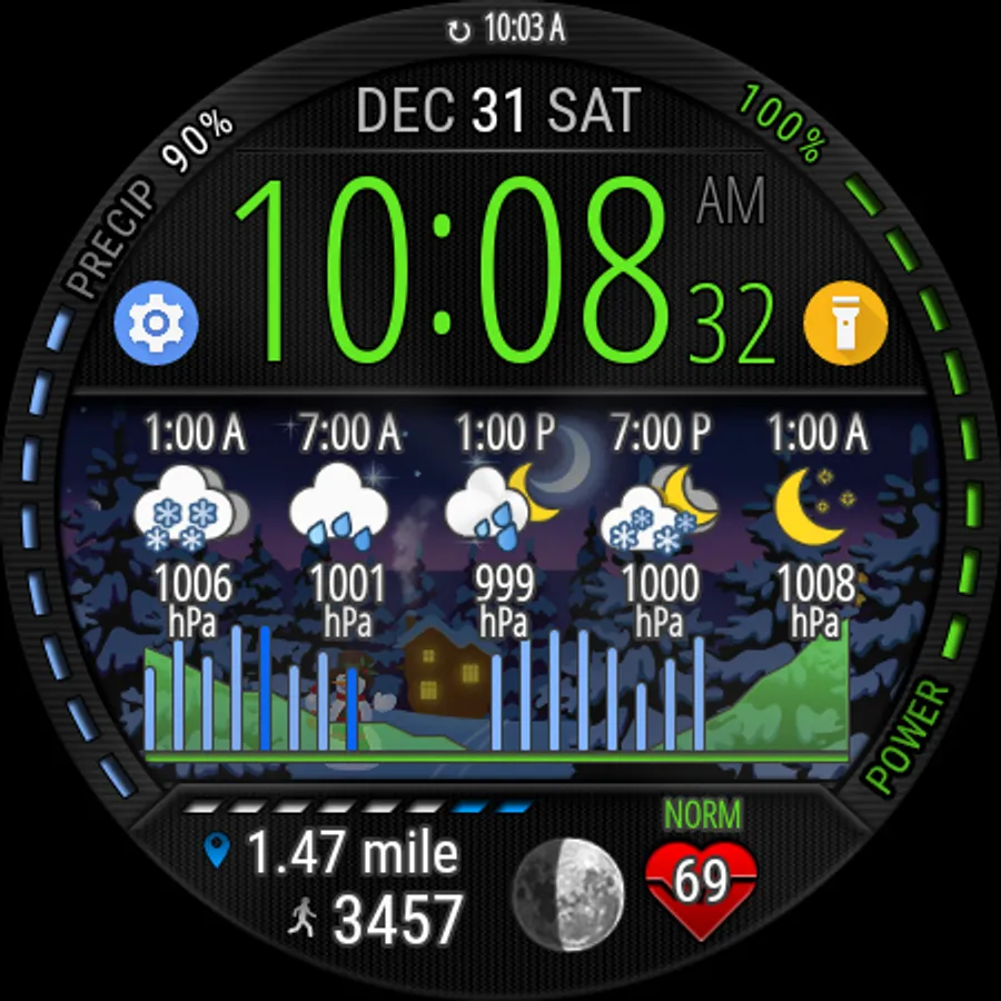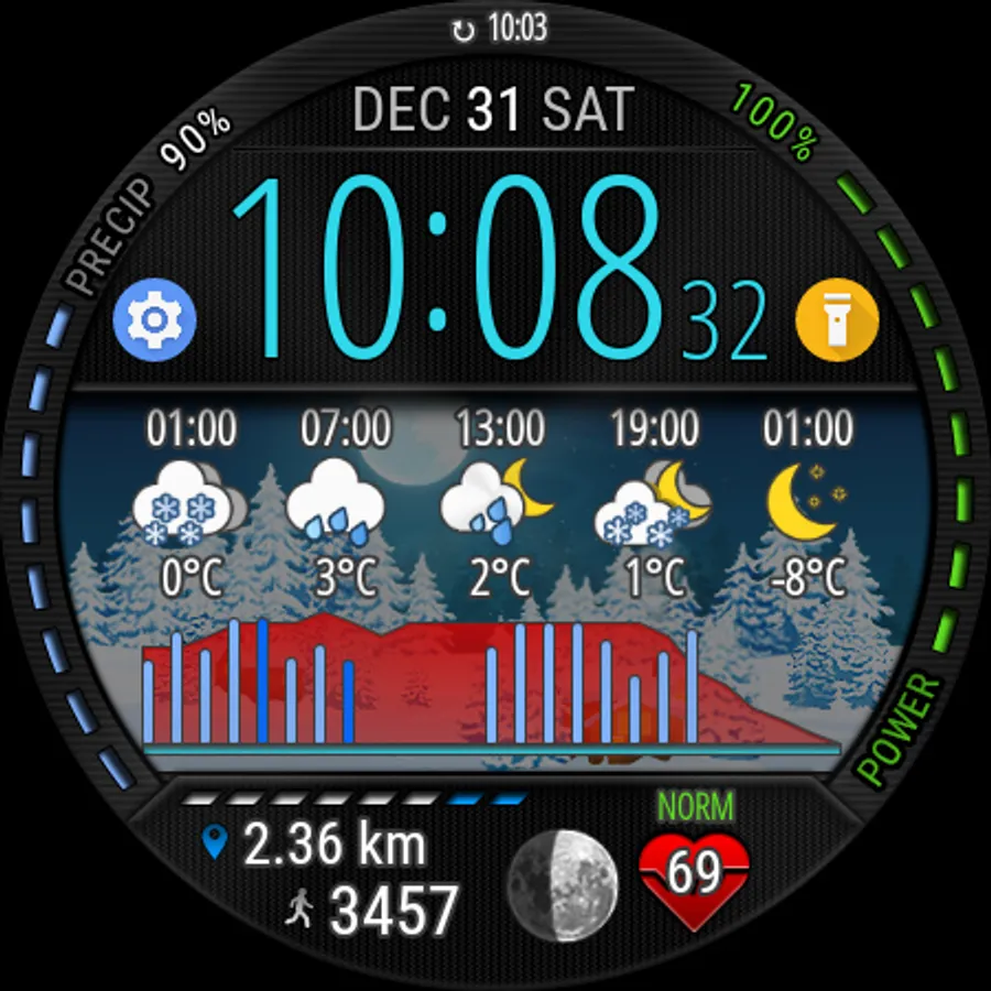 Watch face with weather forecast for 3 days, 25-hour forecast charts, 8 time symbol colors and 8 backgrounds.
