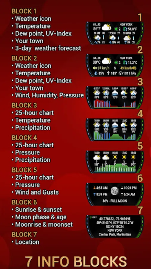 The information block in the middle can be displayed in 7 modes (3-day forecast, current weather, 3 types of 25-hour weather charts, sun and moon info, current location).