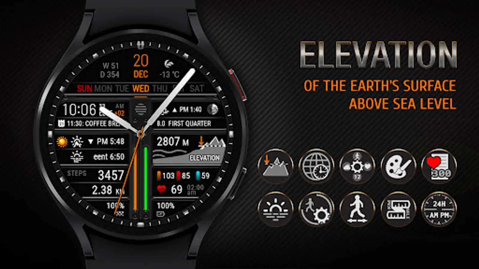 Information watch face showing the elevation of the earth's surface above sea level according to your GPS coordinates.