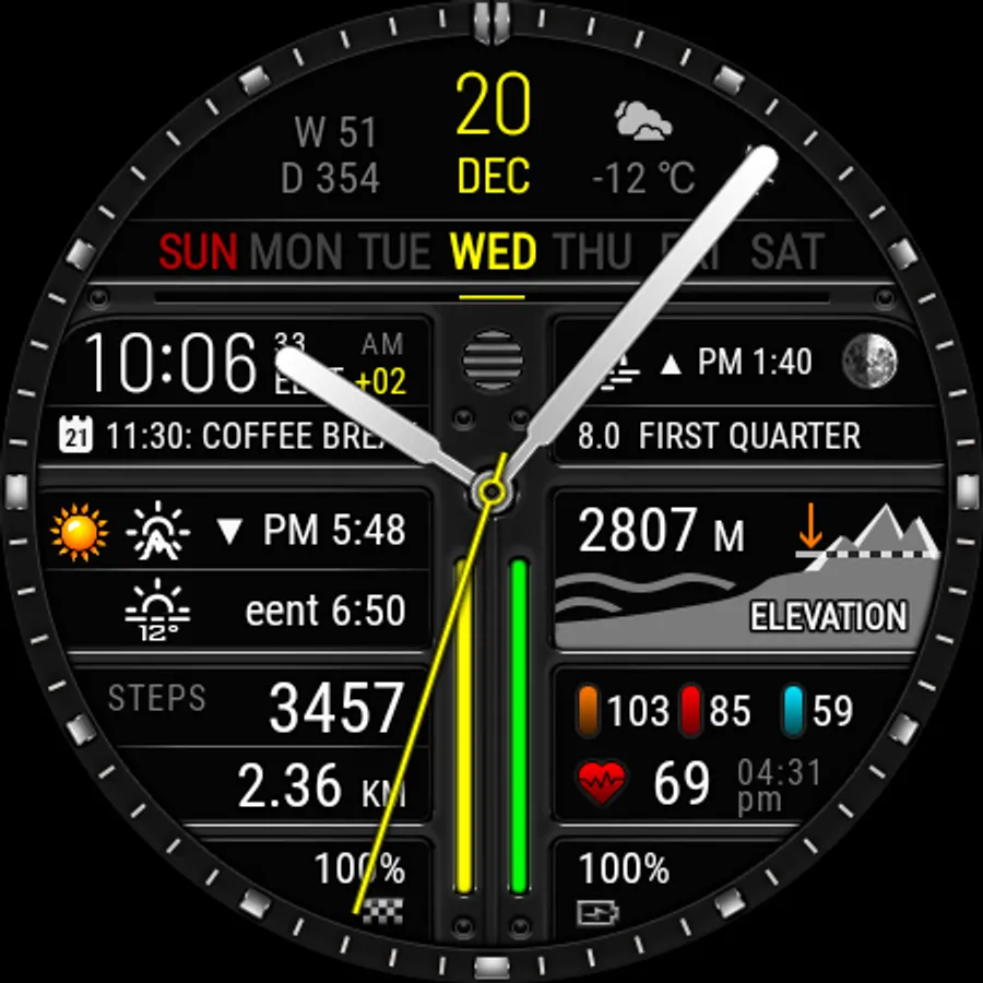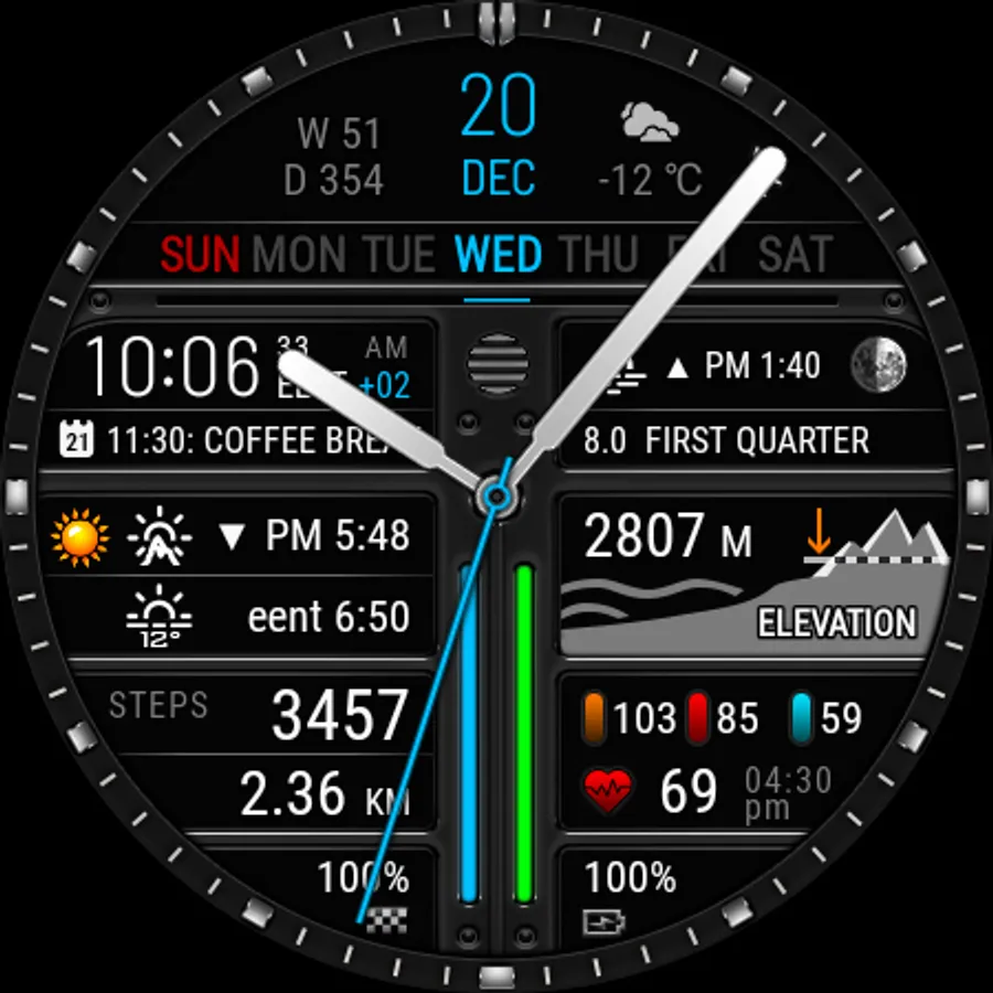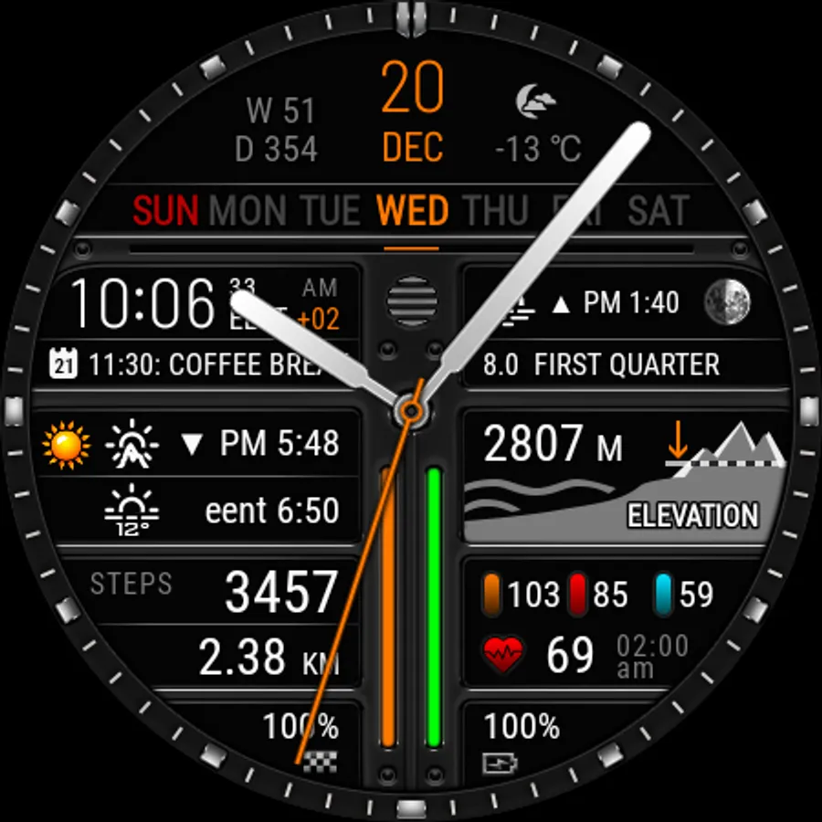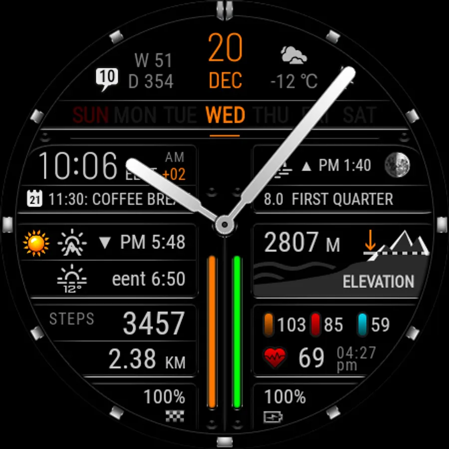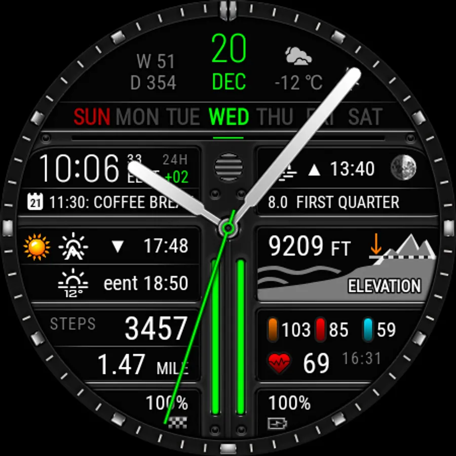 • All information about sunrise / sunset, moon age, moonrise / moonset, etc. is calculated by the watch face independently of stock apps.