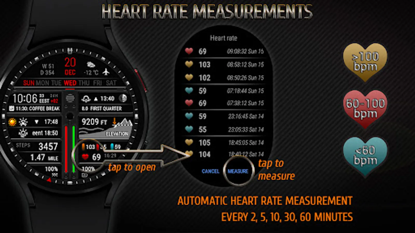 • This watch face independently measures your heart rate. This watch face does not receive data from stock Wear OS heart rate apps.