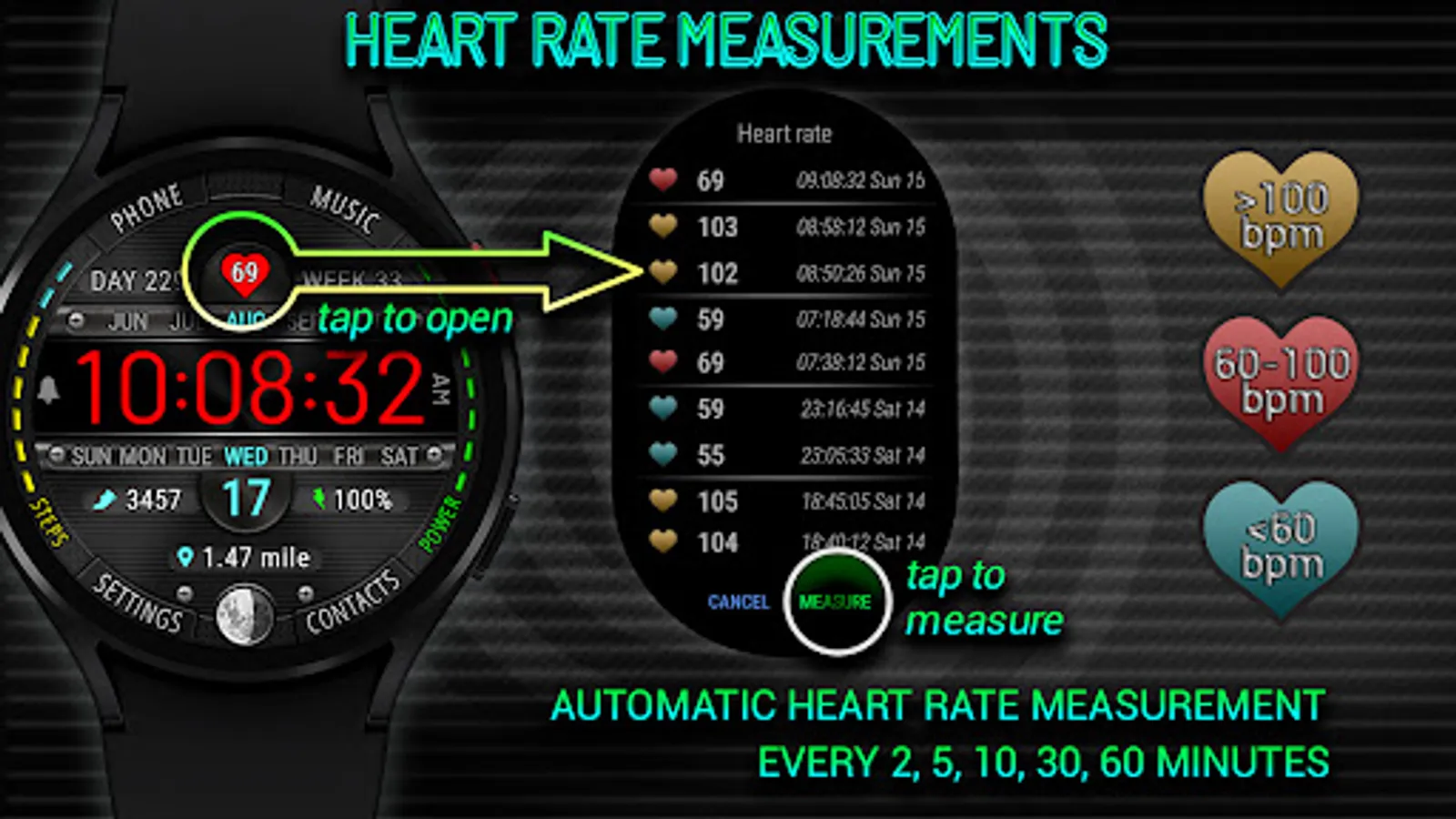 • This watch face independently measures your heart rate. This watch face does not receive data from stock Wear OS heart rate apps.