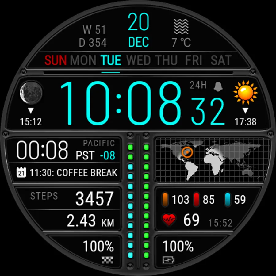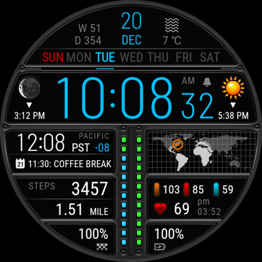 The unique feature of this watch face is a day and night world map, which is updated in real time. Your current location is also marked on this map.