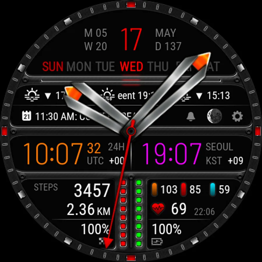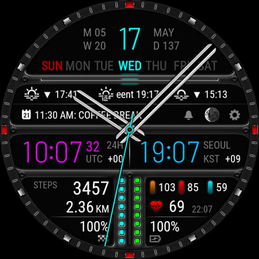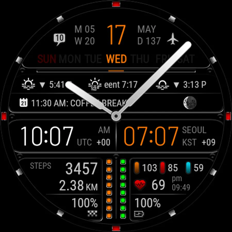 • All information about sunrise / sunset and moonrise / moonset, etc. is calculated by the watch face independently of stock apps.