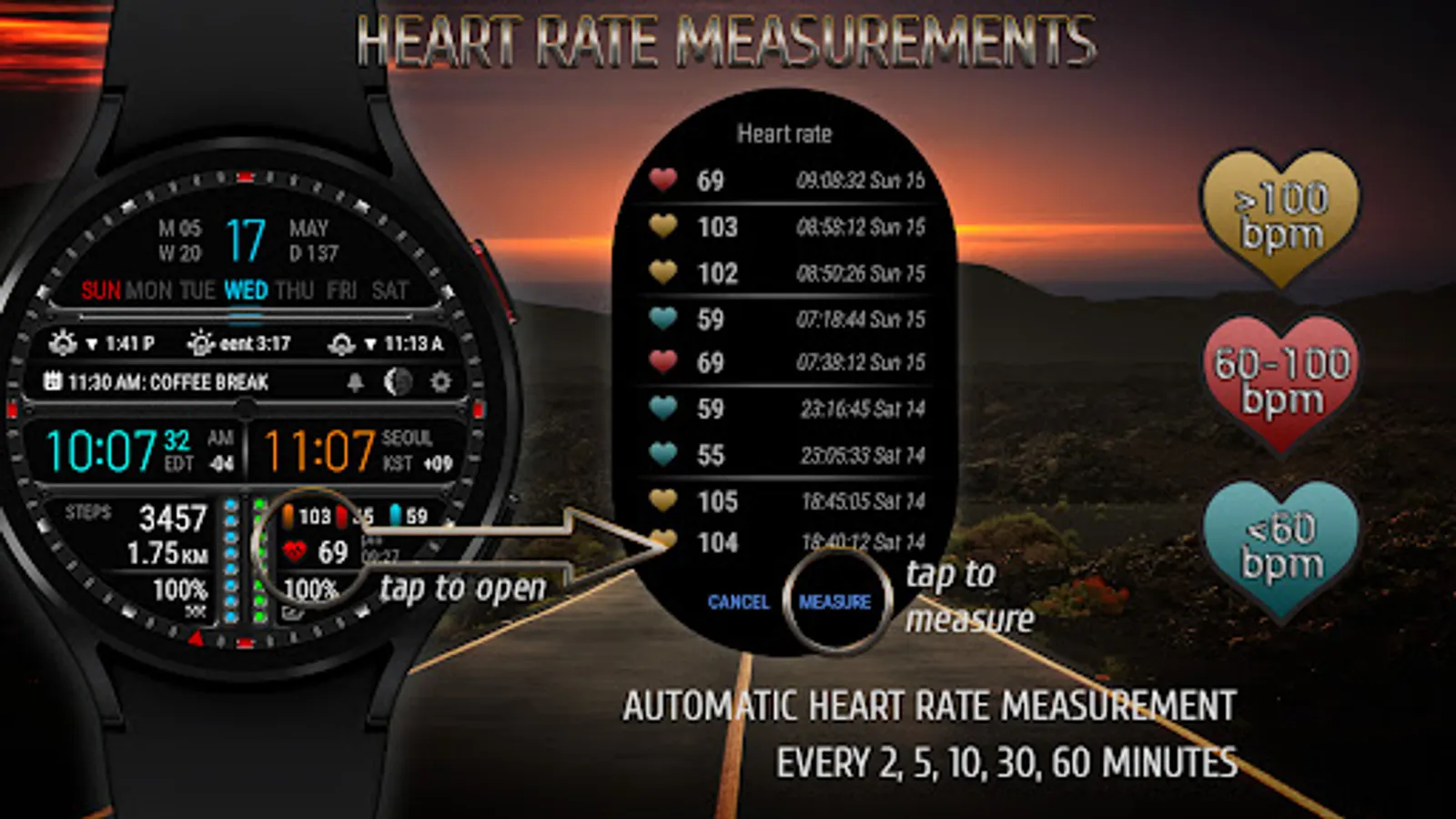 • This watch face independently measures your heart rate. This watch face does not receive data from stock Wear OS heart rate apps.