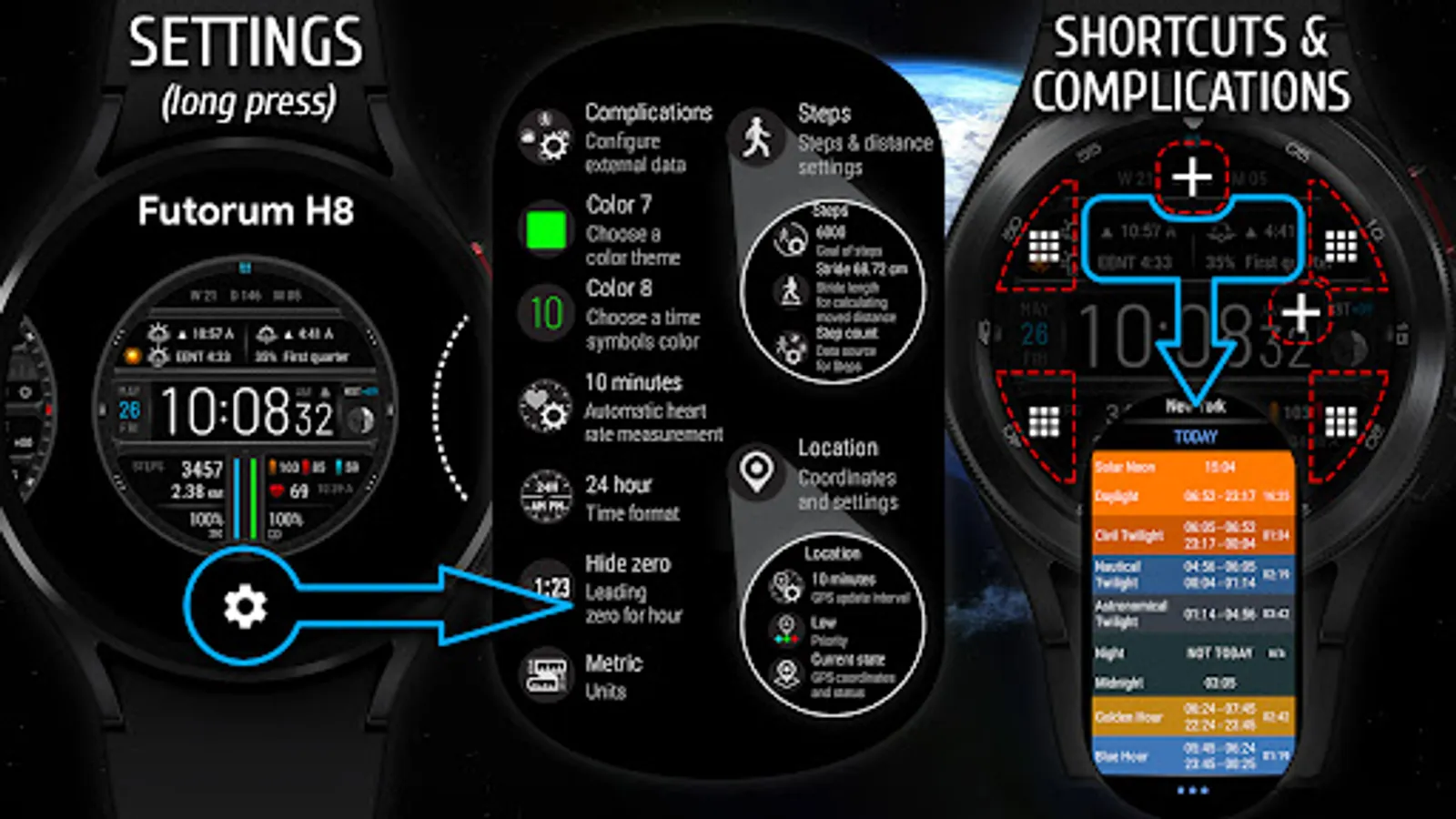• All information about sunrise / sunset and moonrise / moonset, etc. is calculated by the watch face independently of stock apps.