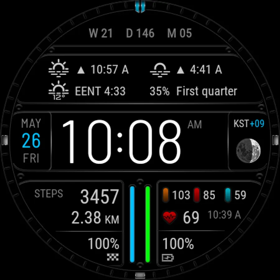 This watch face is available on devices running Wear OS 2.4 and 3+ (API 28+), primarily the Samsung Galaxy Watch 4/5 & Google Pixel Watch.