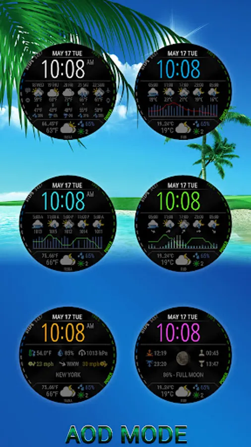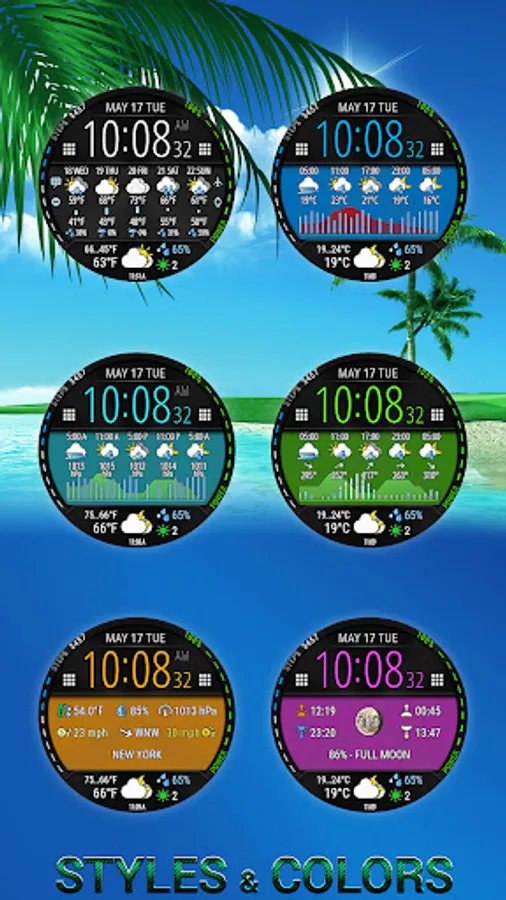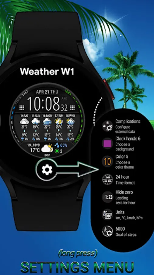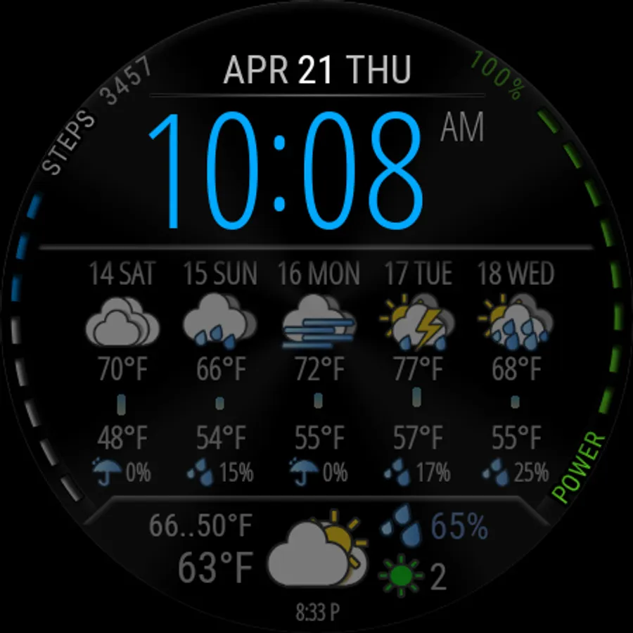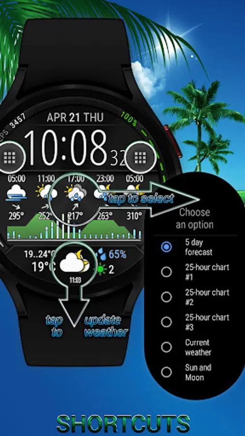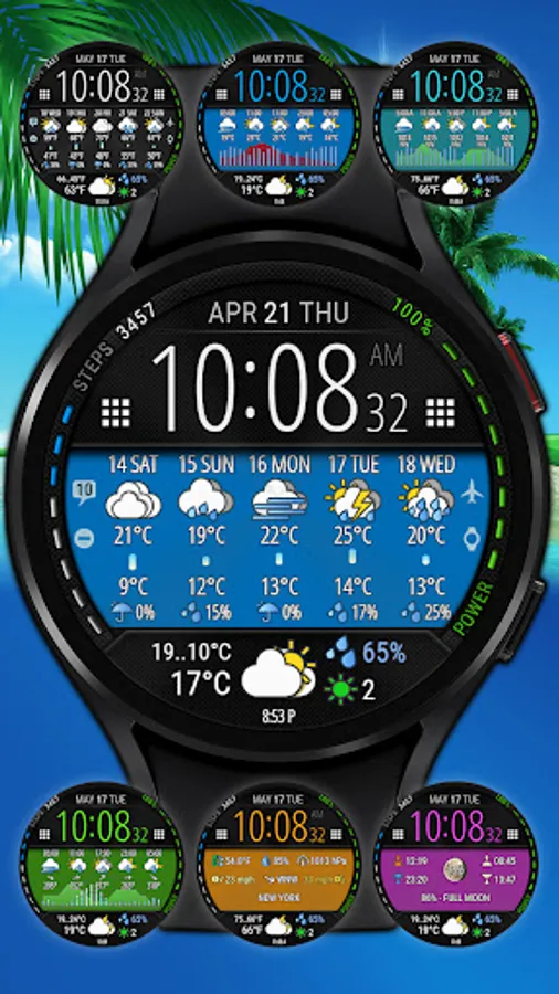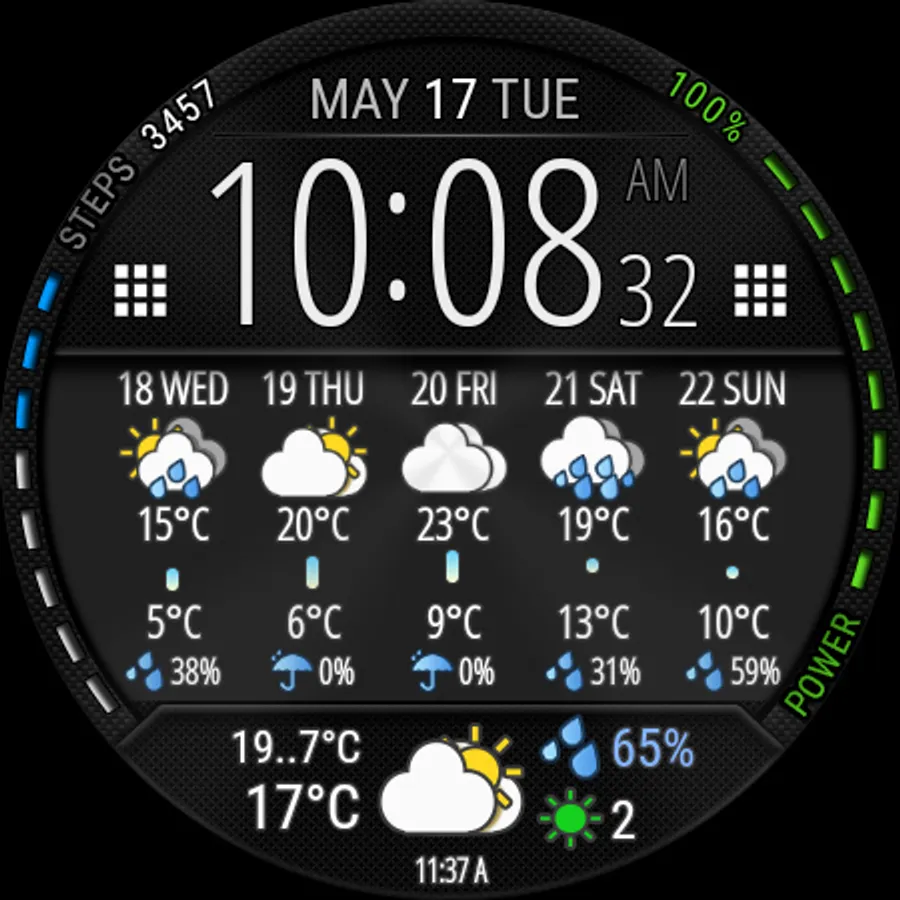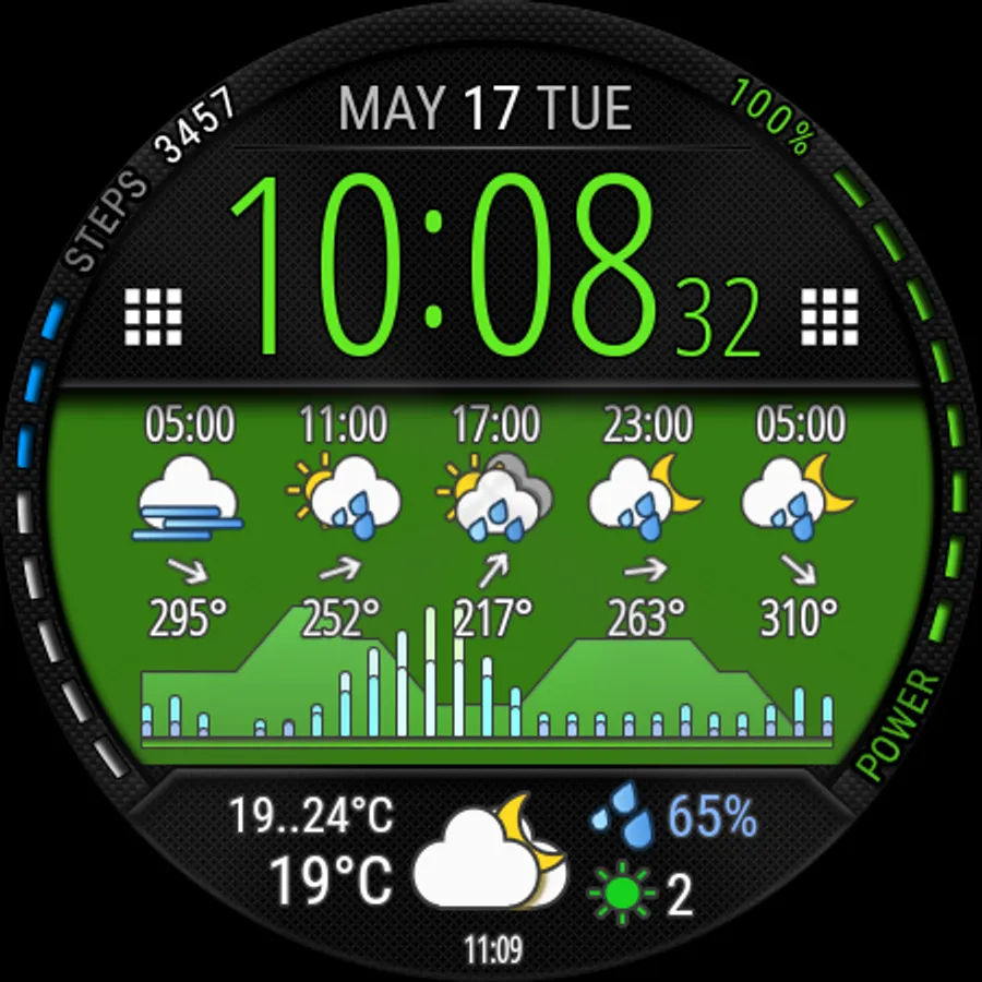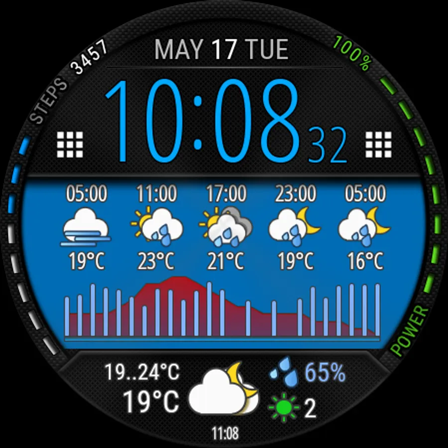 Watch face with weather forecast for 5 days, 25-hour forecast charts, 6 time symbol colors and 6 background colors.