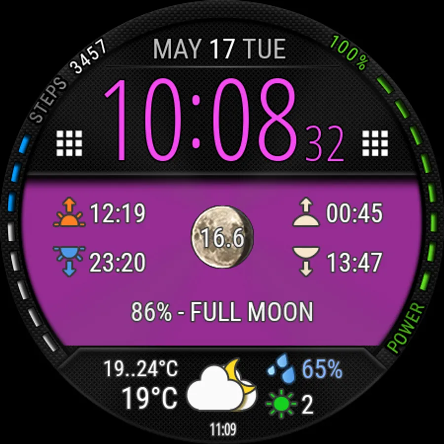 🚩 All weather information, as well as sunrise, sunset, moon age, etc. are calculated independently by the watch face.