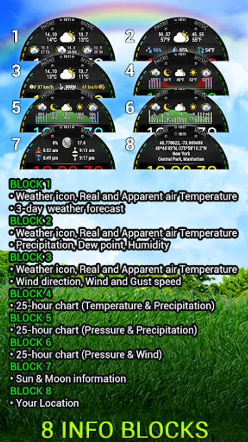 🚩 All weather information, as well as sunrise, sunset, moon age, etc. are calculated independently by the watch face.