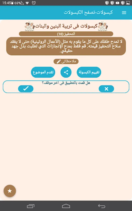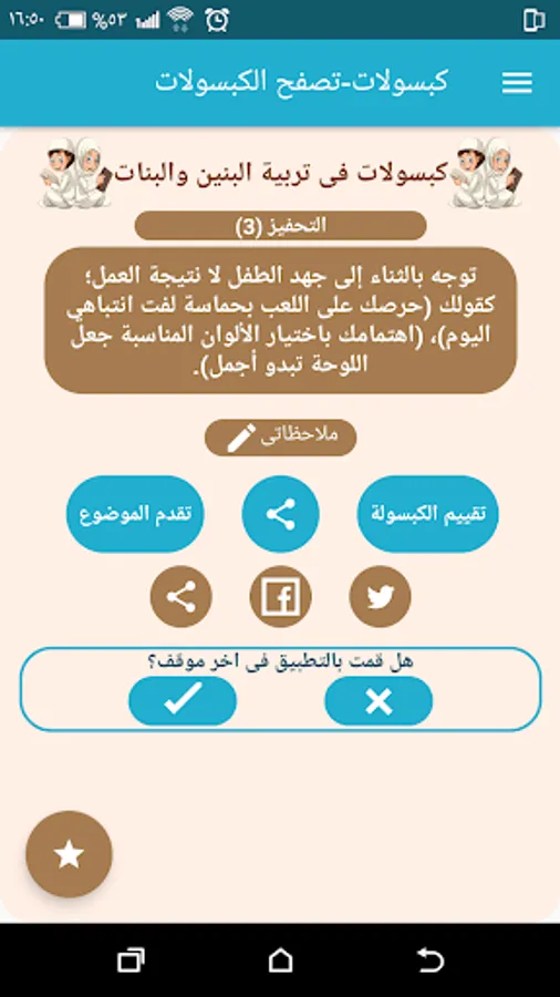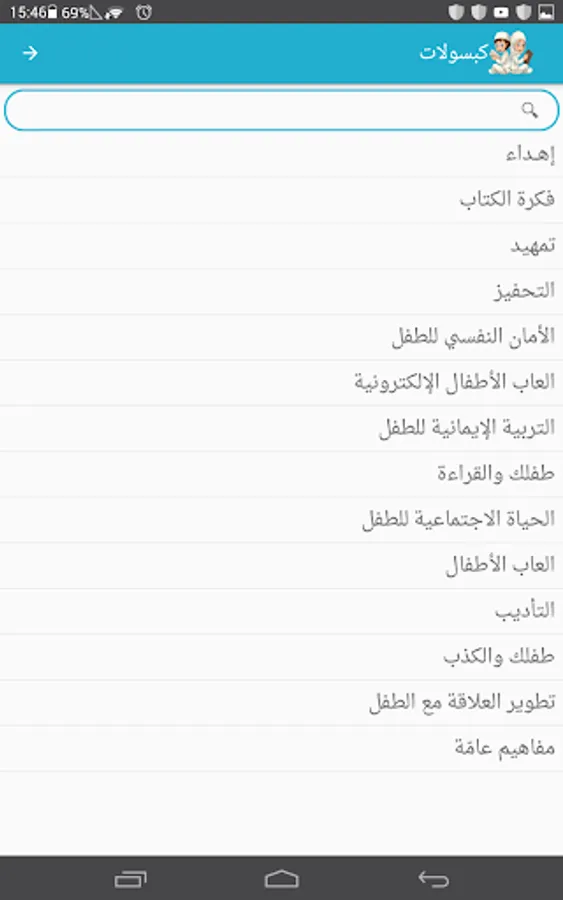 - Applying educational concepts and experiences in the form of intensive doses that are easy for parents to absorb, but also to help them to understand and develop the relationship with their children. The application helps more than 200 educational educators and family educators in educational schools and nurseries to obtain abstracts of educational theories and life experiences in the form of (capsules) fast without addressing the details or complexities, the formulation of concepts in easy language limited words do not exceed only 140 characters.