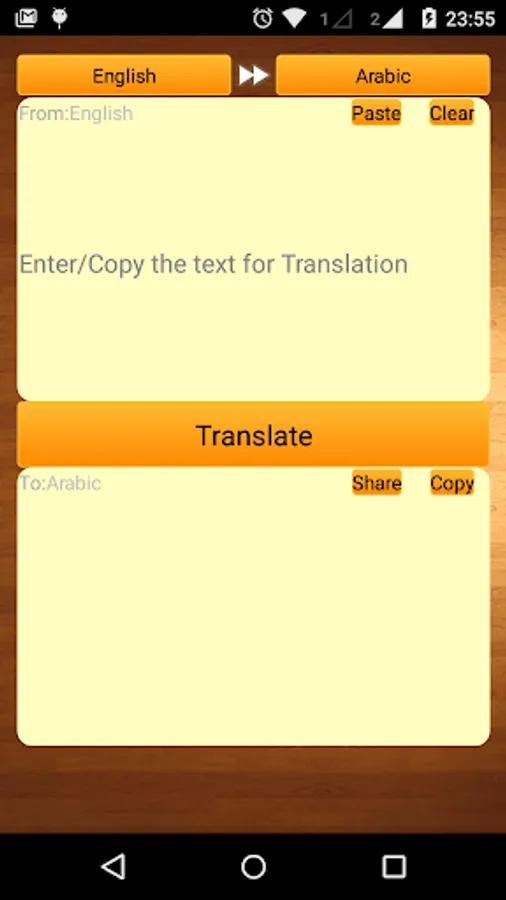 Choose the language in which the text would be entered and also the language to which the text needs to be translated. Enter the text using keypad or using the paste feature. Click on the translate button and the translated text would appear below. The 'copy' button allows to copy the text.