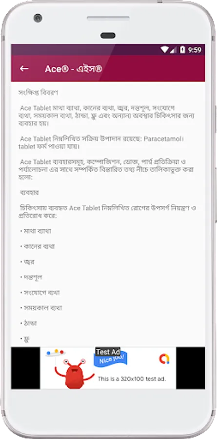 আমরা এই অ্যাপের মাধ্যমে বিভিন্ন ঔষধ কৌম্পানির বিভিন্ন ধরনের ঔষধ সম্পর্কে বর্ণনা করেছি। কোন ঔষধের কি জেনেরিক নাম, তার কাজ কি, কিভাবে বানানো হয়েছে এবং ঔষধের পার্শ্বপতিক্রিয়া নিয়ে বিস্তারিত বর্ণানা করেছি। এছাড়াও গর্ভবতী মায়ের জন্য কোন ঔষধ ভাল হবে অথবা খারাপ হবে তা নিয়েও আলোচনা করেছি।