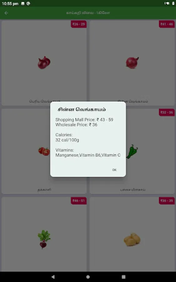 Kaikari(காய்கறி) Vegetable Price app uses to get wholesale, retail, and selling prices.It also tells each vegetable calories and vitamins contains.