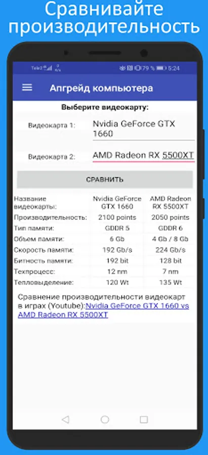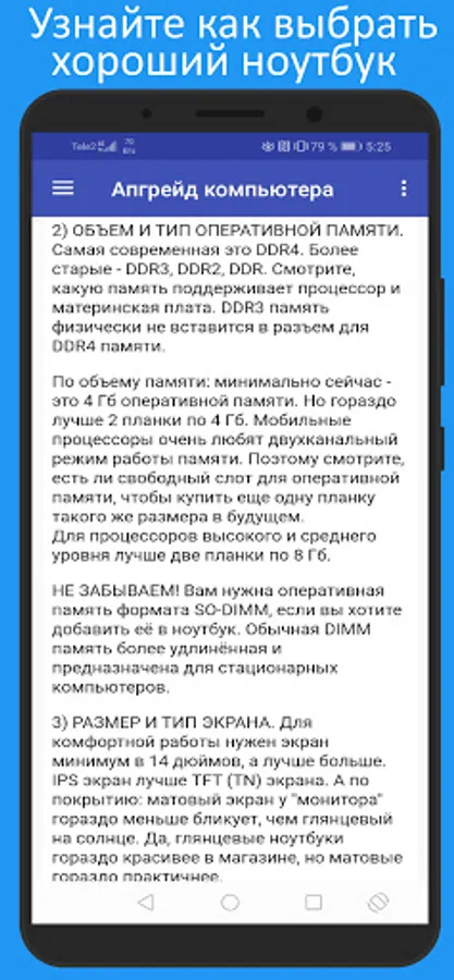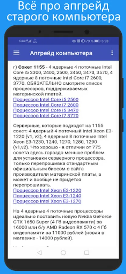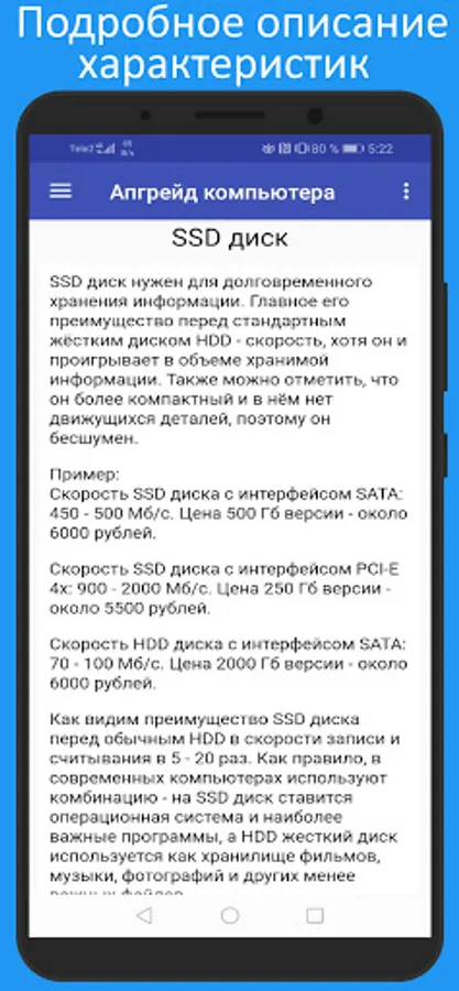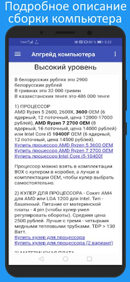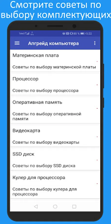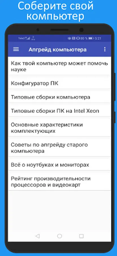 Our application lists ready-made assemblies, as well as tips on choosing a motherboard, processor, RAM, video card, SSD drive, power supply, case and other PC components.