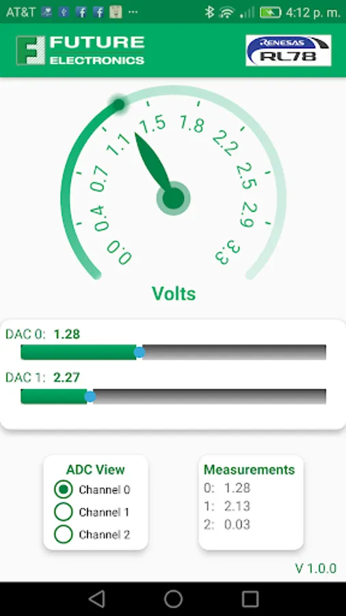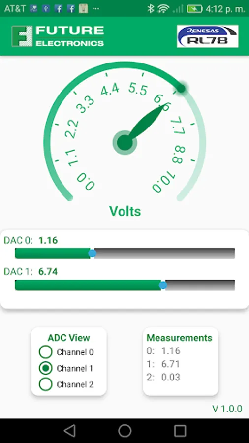 This application demonstrates Digital to Analog (DAC) & Analog to Digital (ADC) features of the ultra-low power Renesas RL78/L1A microcontroller with RL78/G1D Bluetooth Low Energy module.