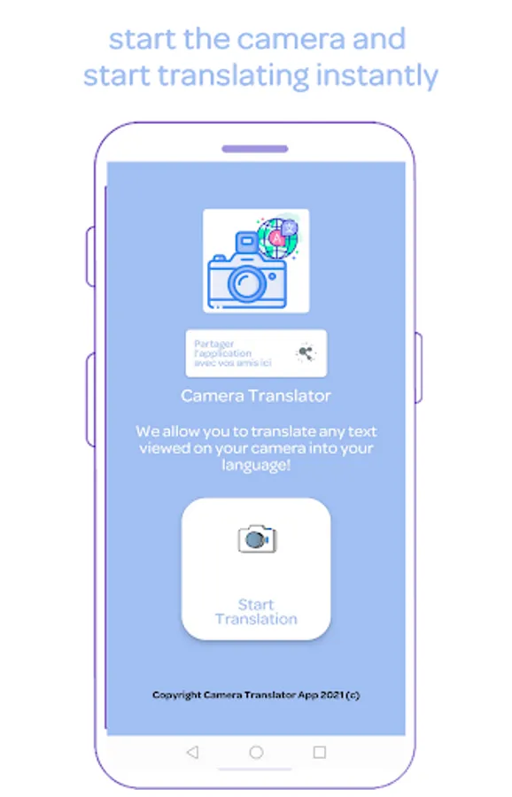 Camera Translator is a free Application it allows you to detect with an expert algorithm the language displayed instantaneously on your camera and translates the displayed text to you in a few moments, we manage more than 100 languages.
