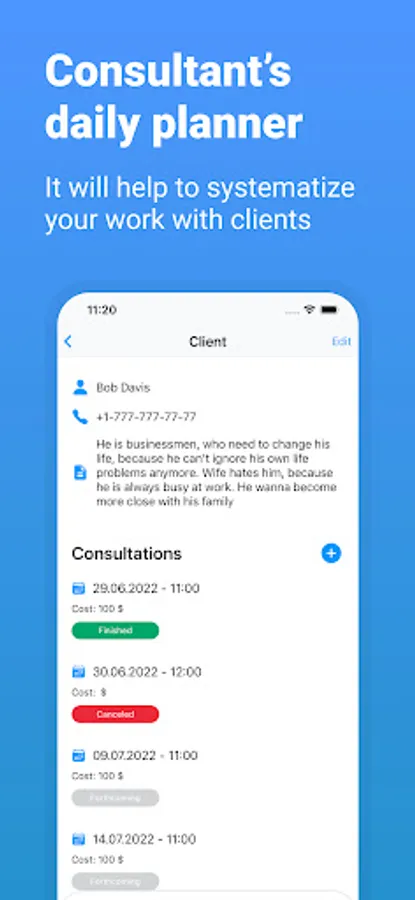 Plunjo is a mobile organizer application for consultants. It allows you to store all your records about consultations and clients in your smartphone, which is always at hand. The application is suitable for anyone who advises people or businesses. Among those who will be helped by the application: coaches, psychologists, business consultants and others.