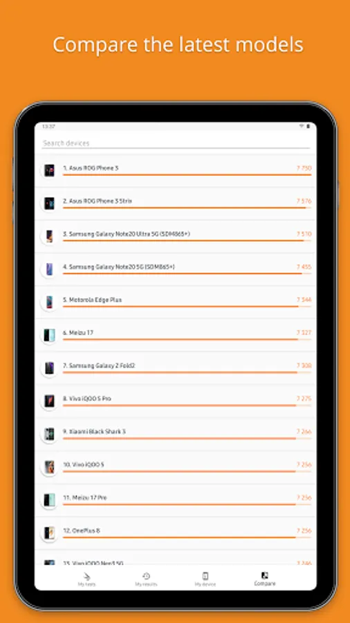 With in-app performance data for thousands of devices, it is easy to find and compare the best smartphones and tablets with 3DMark. Search, filter and sort the in-app rankings to compare the latest Android and iOS devices.