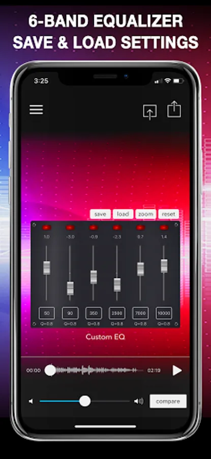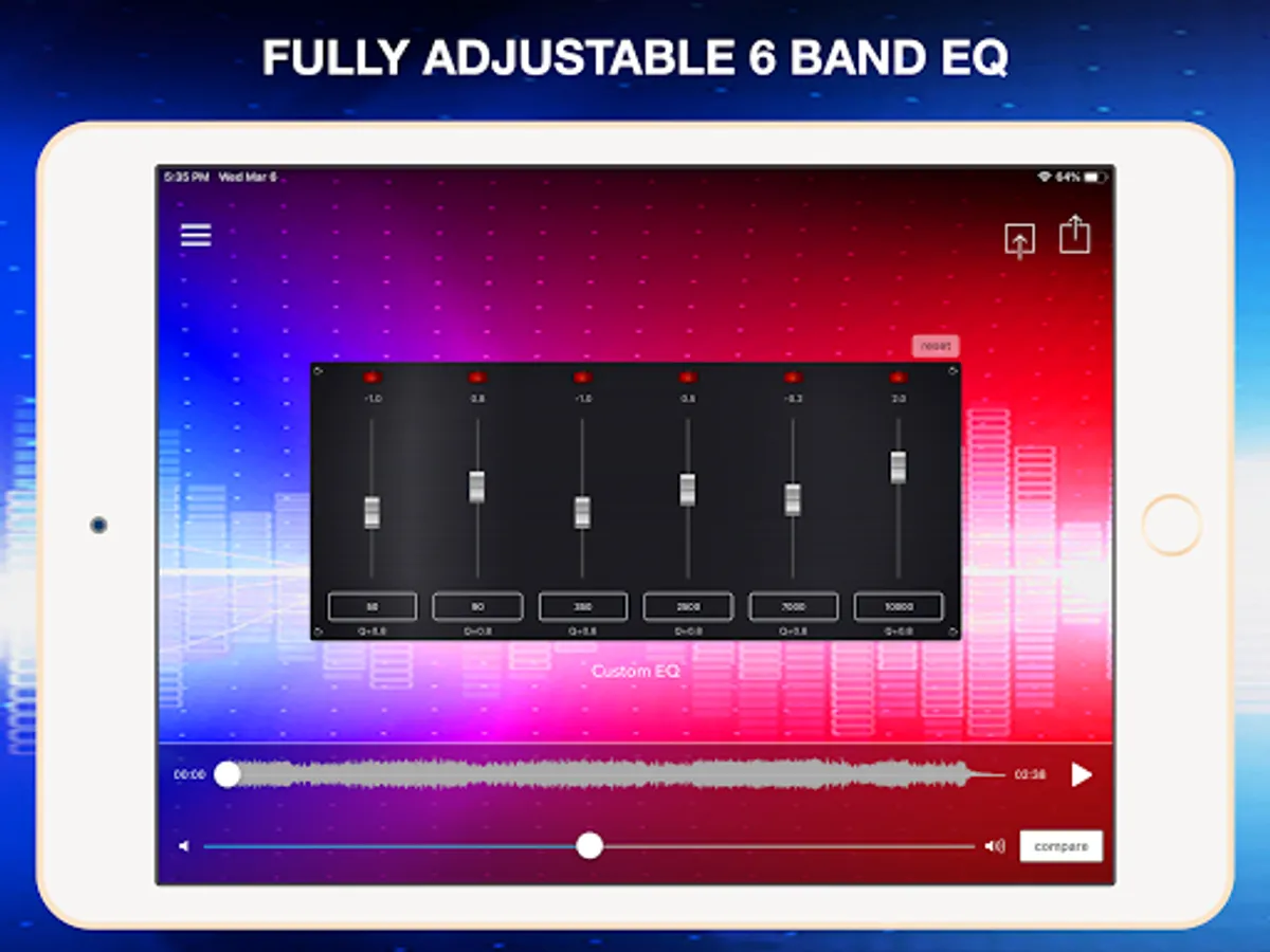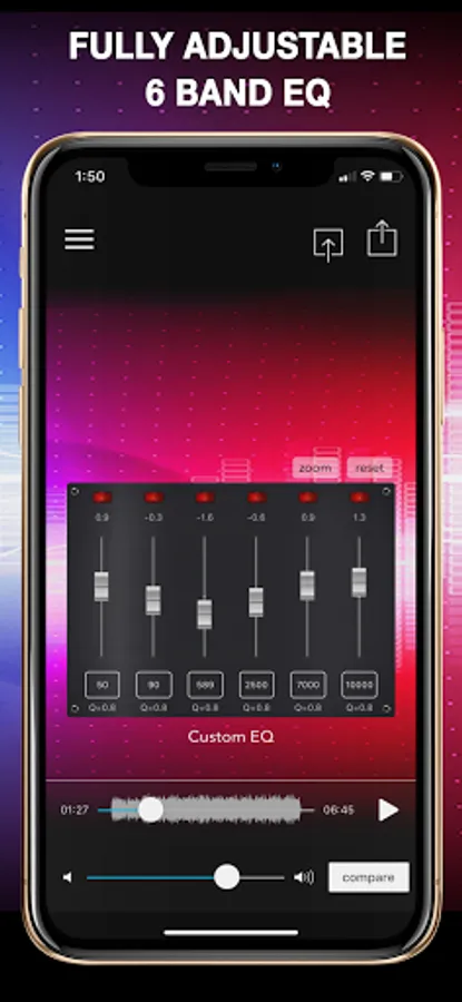 Choose between our fully adjustable 6 band equalizer or presets of 3 settings per genre. Export, save and share anywhere.