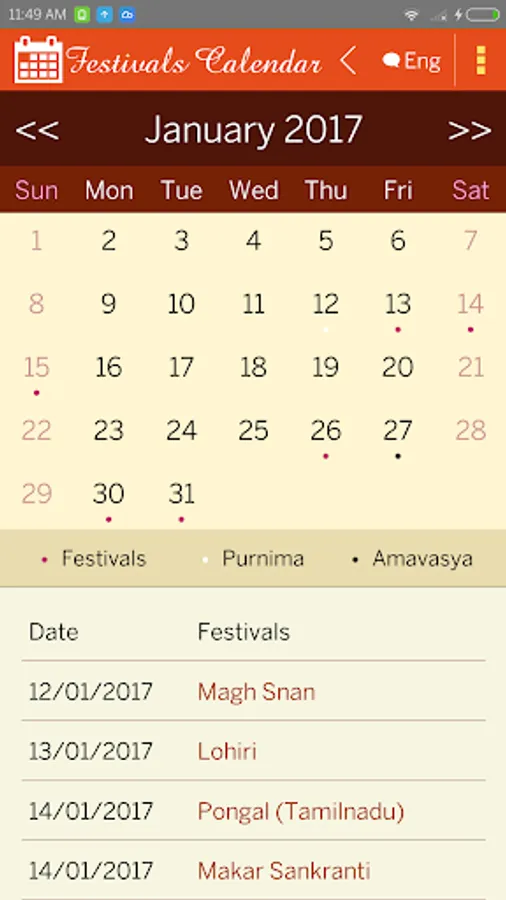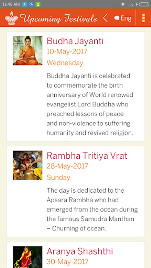 Festivals Information:- In festival section not only the accurate dates of festivals rather the significance, history and the method of celebration of each festival has also been described. In addition to that the upcoming festival sections gives the list of upcoming festivals so that the user of the app updates and prepares himself accordingly. Similarly in fast (Vrat) section the list of fasts with significance & method of observing fasts have been described.