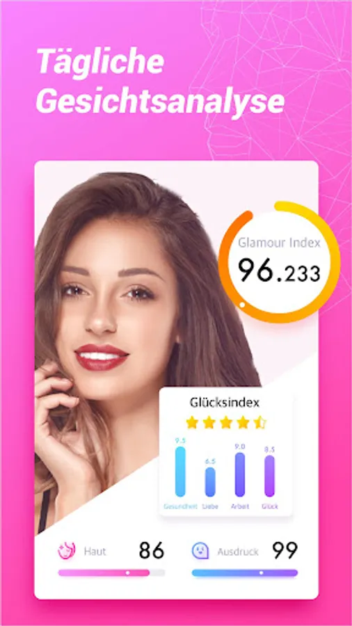 What is your beauty index today? How is your skin condition? After shooting or uploading your photo, we will analyze your facial features with the professional technique and then you will get a comprehensive report. In the report, you can see your beauty index, skin condition and expression score. Meanwhile, there are also love, health, fortune and work index and corresponding suggestions for you.