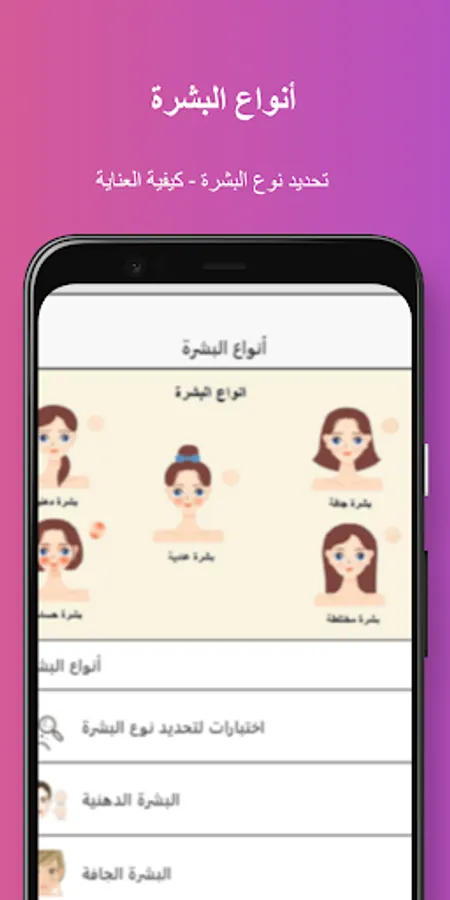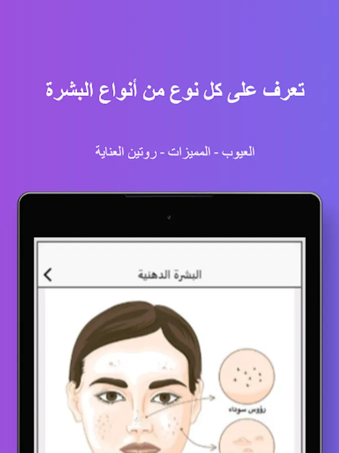 With our facial care app at home, you can take advantage of a wide range of services and features. The application provides you with a comprehensive skin care guide, where you will find a skin care routine (morning - evening - weekly) and provides you with tips for cleansing, exfoliating and moisturizing your skin. And you will be able to know your skin type through an easy and simple test that is applied at home and provides a detailed explanation for each type of skin and how to take care of it.