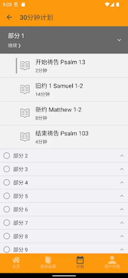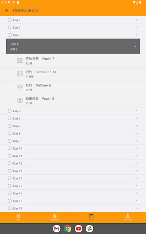 The content of each reading includes: two psalms as the beginning and end of prayer, a passage from the Old Testament, and a passage from the New Testament. If you use the 45-minute and 60-minute Bible reading plan, you can read the Old Testament once and the New Testament twice in two and a half years.