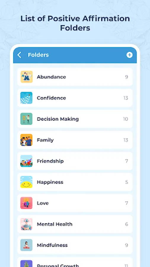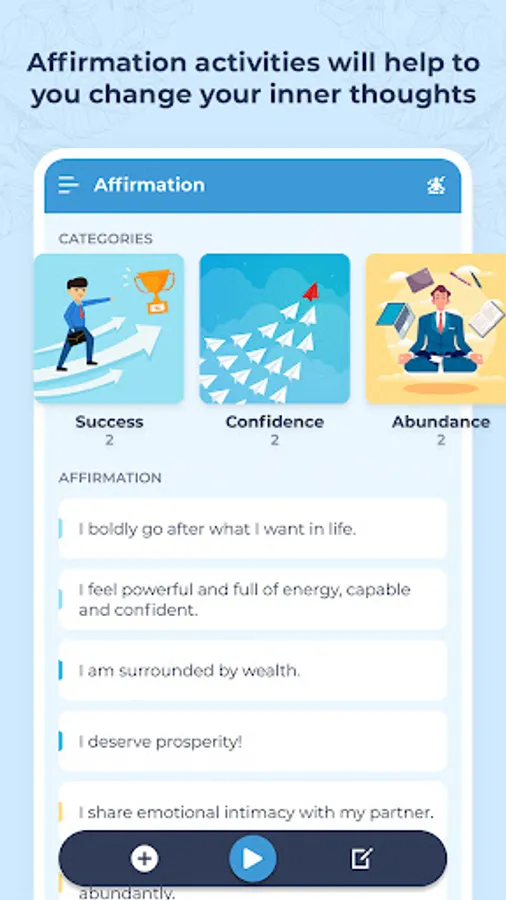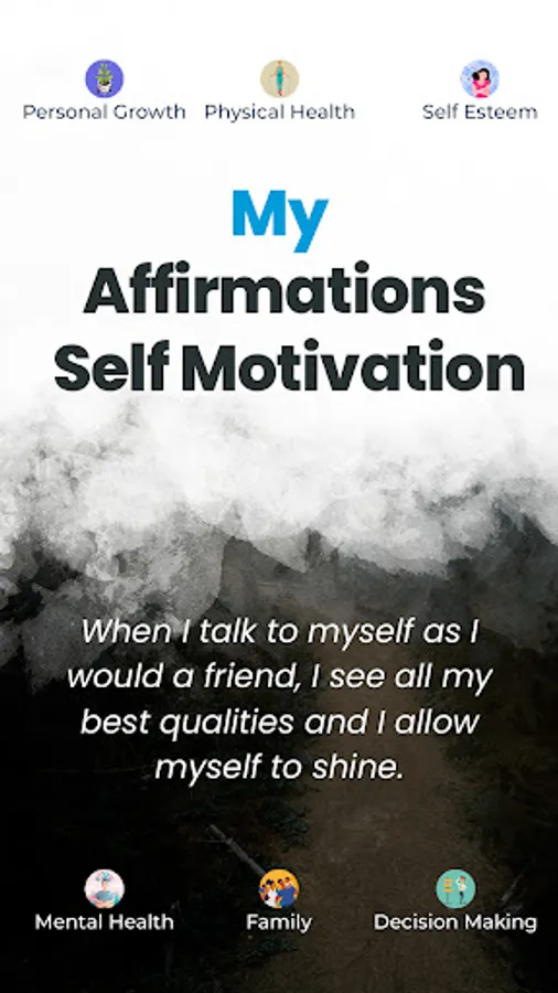 My Affirmation - Self Motivation app contains 16 different affirmation categories like success, confidence, abundance, Self Esteem, Happiness, Mindfulness, Decision making, Personal growth, Physical health, Mental health, Love, Relationship, Friendship, Family, Social, and Woman.