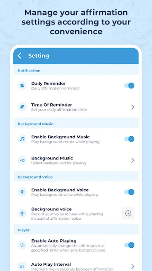 Select your affirmations from different categories and My Affirmation - Self Motivation app will play active affirmations one by one after given specified time interval.