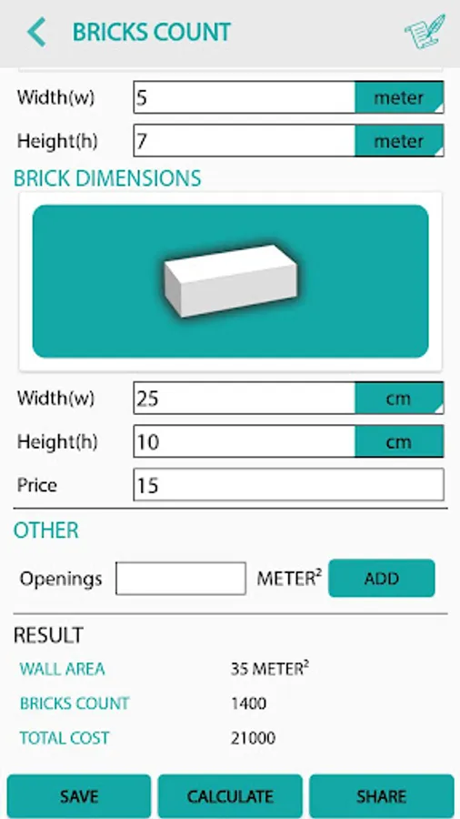 - Calculates concrete mix – Amount of cement, sand, gravel and water for given volume.