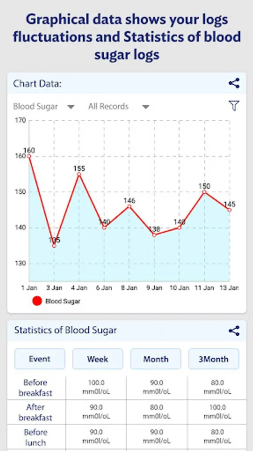 - Shows graph/ Statistics of your blood sugar fluctuations with filters time filter