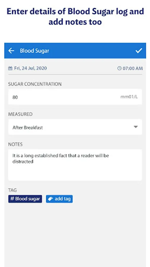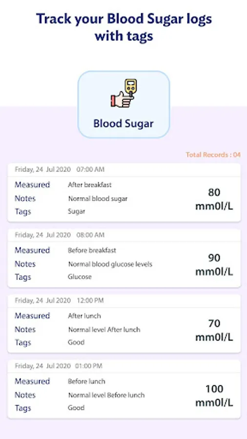 Add tags to each record – so with the help of diabetes logs you will find out your diabetes dynamics, for example, before meals, before breakfast, after lunch, after meals, In Morning, evening etc.
