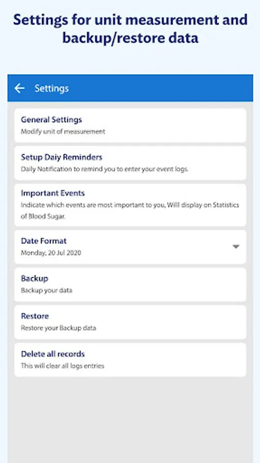 - Set different Blood glucose level units - mg/dl or mmol/l (International and US Standard)