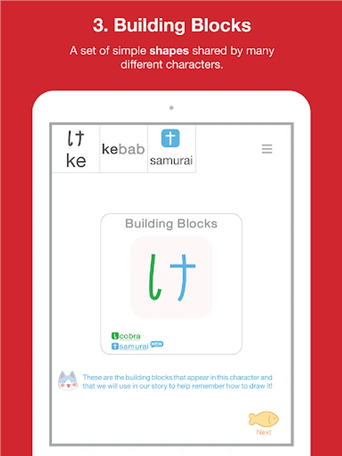 ・Simple stories or 'mnemonics' for each character make learning simple and fun.