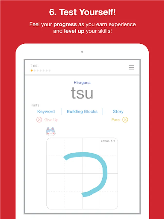 The cool Hirako and Katato mascots are not the only unique feature of Hiragana Quest. We differ from the similar Japanese learning apps with the additional learning tools you can’t find elsewhere. There are guides and trace for each stroke on your screen, you can level up as you learn and test yourself to make sure you are on point with your learning.