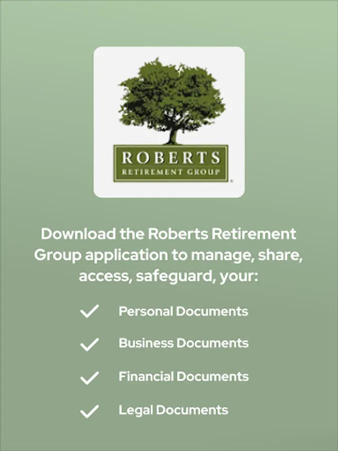 By accessing your personal Roberts Retirement Group Vault, you can easily (and securely) access, store, and manage your personal, financial, and business documents on the go, 24/7. Your personal Vault will allow you to receive and share critical documents and information securely with the Roberts Retirement Group team, giving you the peace of mind you deserve.