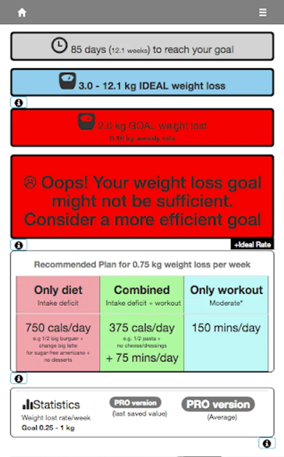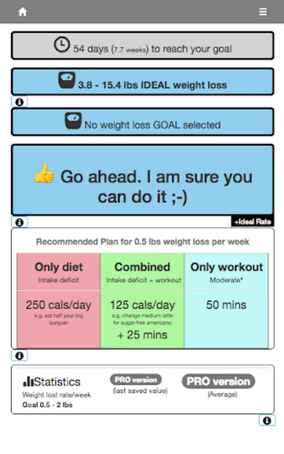 1) Calculates your Ideal and Goal Weight loss rate. If you provide a goal weight, it will advice you about your goal. Alternatively, you can leave blank the goal weight and the app will calculate the best weight loss rate for you.