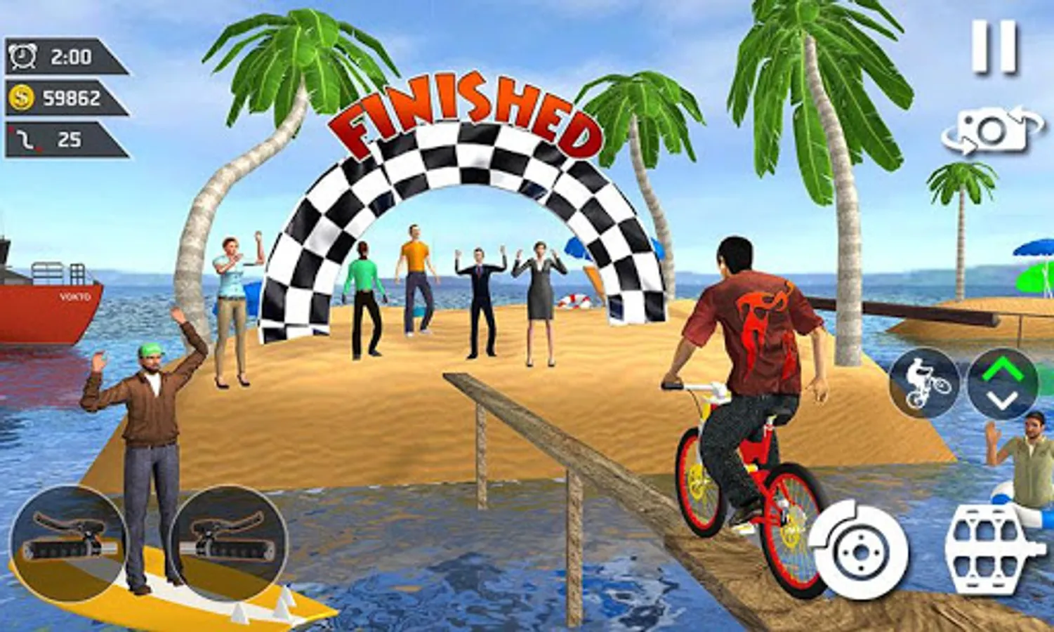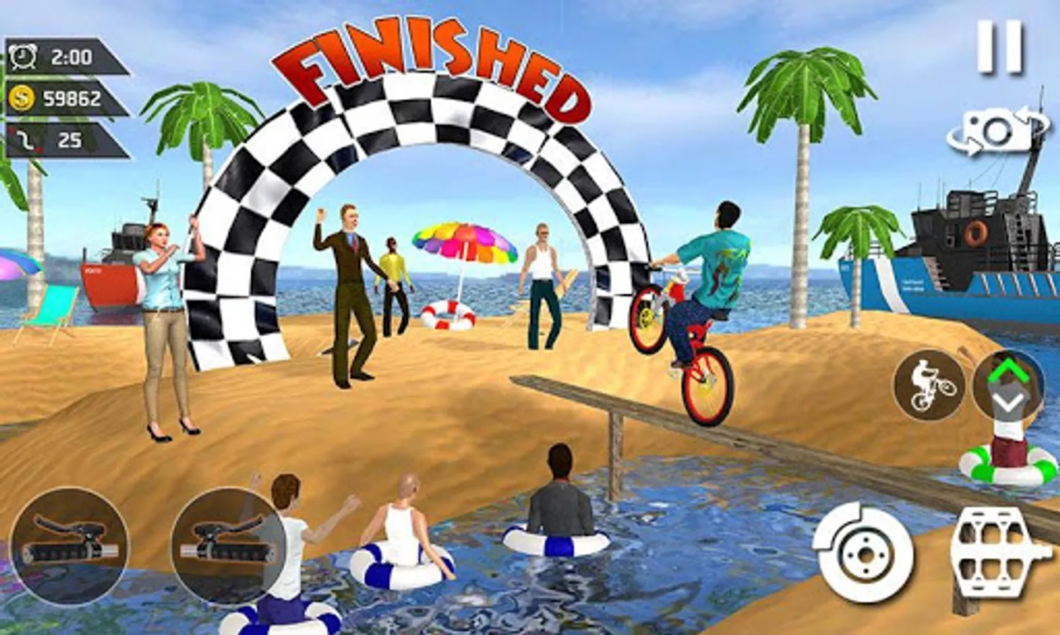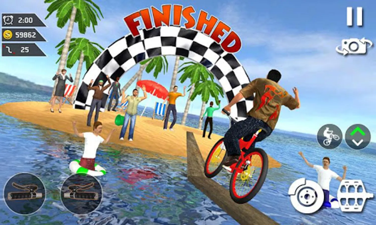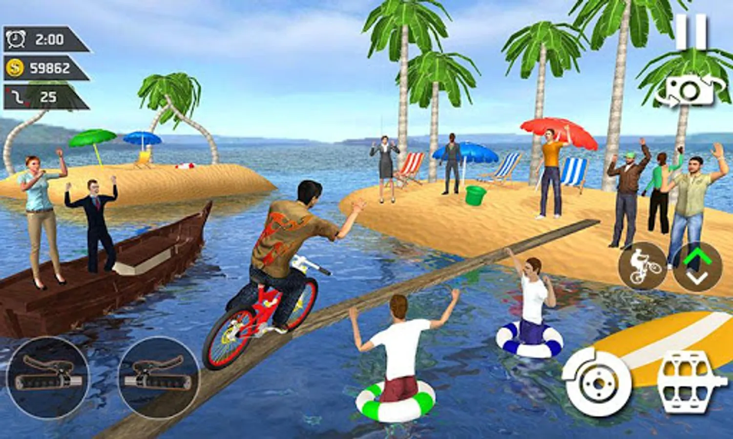 Get into the waterpark for enjoying the new way of water park bicycle racing on the edges of the deep seas. You may be a novice to this water adventure game but soon you will be highly addicted to this water surfing game due to its variety of bicycle surfers. There are the variety of bicycles available in the game store you can purchase it with the in-game cash. The more you complete the challenging missions of bike rider the more you would earn the in-game cash for earning the other bmx cycles.