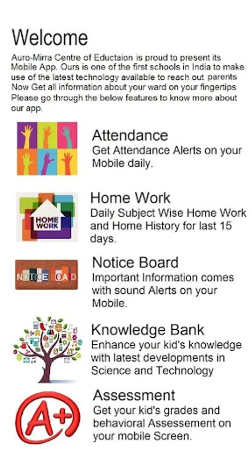 Auromirra Centre of Education is proud to present its mobile app. This app will help out parents to know about Attendance of their wards alongwith with performance in the school. Get Alerts of Notice Board, Homework, Class Test Marks. Parents can check School News and Activities on their Mobile. Pics of School Functions can be seen and downloaded from the app itself. Many Other Features like School Calendar, Bus Tracking, Competitions etc. will be available. Please use the username and password provided to you to login into the app.