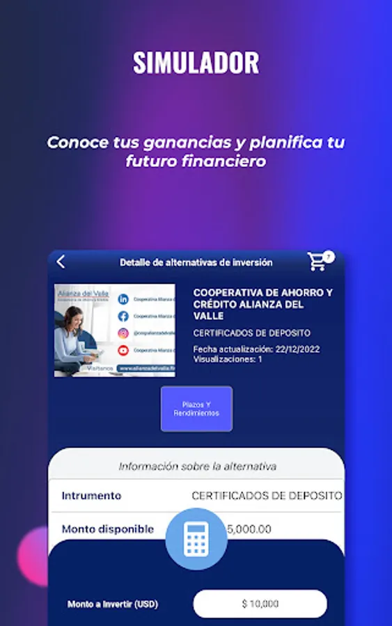 Thanks to our app, you will be able to enjoy various functionalities, such as viewing and having multiple investment alternatives from your cell phone, such as shares, commercial invoices, commercial paper, obligations, among others; Furthermore, if required, you can quickly schedule a virtual appointment with our specialists and advisers to resolve any questions or concerns. We also give you the option to easily simulate the investments you are thinking of making.