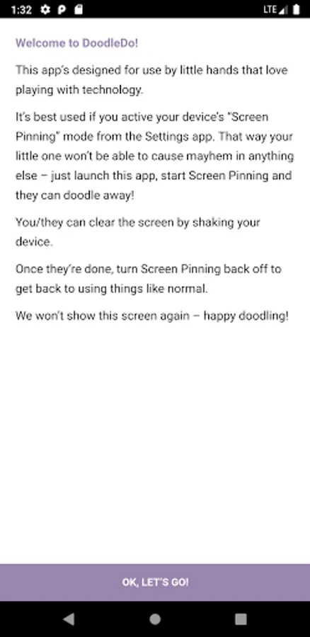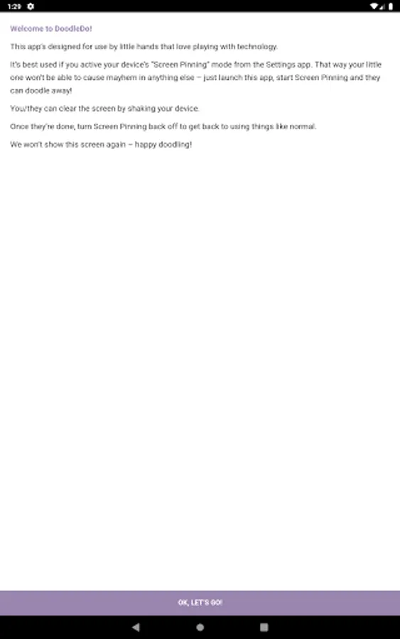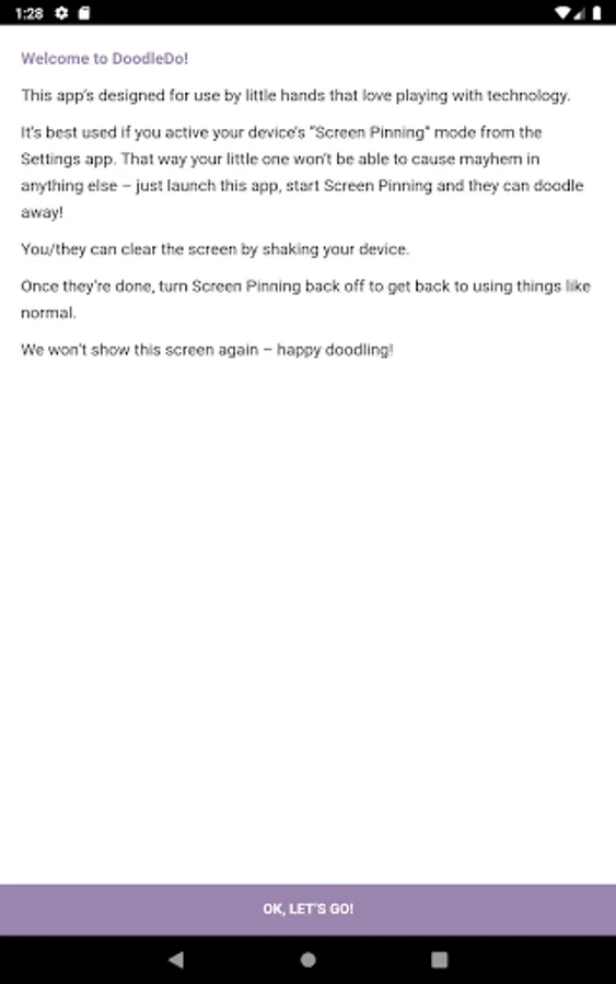 It’s best used if you active your device’s “Screen Pinning” mode from the Settings app. That way your little one won’t be able to cause mayhem in anything else – just launch this app, start Screen Pinning and they can doodle away!