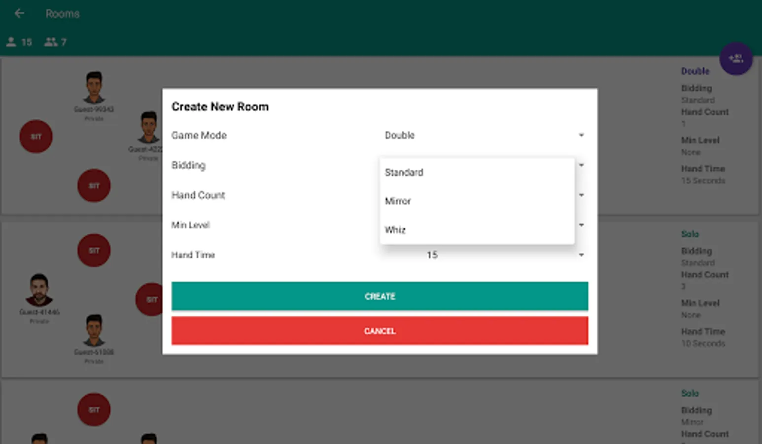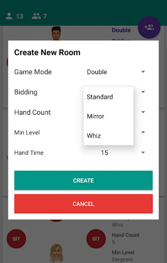 Bidding modes: Standard, Whiz, Mirror, Suicide,