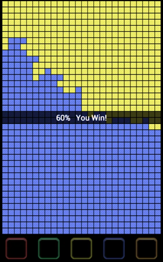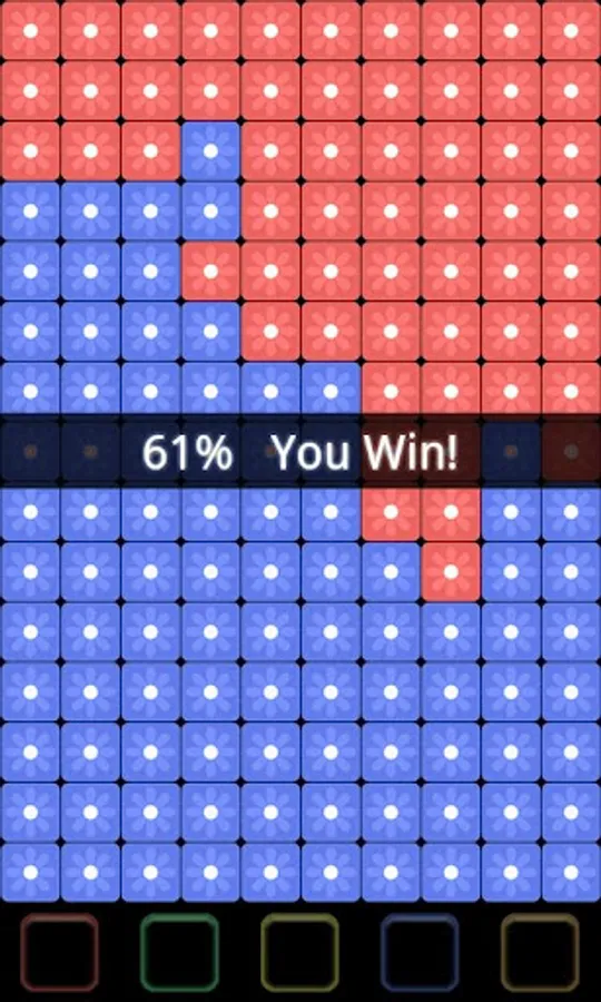 When a button is pressed, the player's area changes to the corresponding color and absorbs adjacent tiles of the same color. Player that was able to absorb more tiles than his opponent by the end of the game wins.