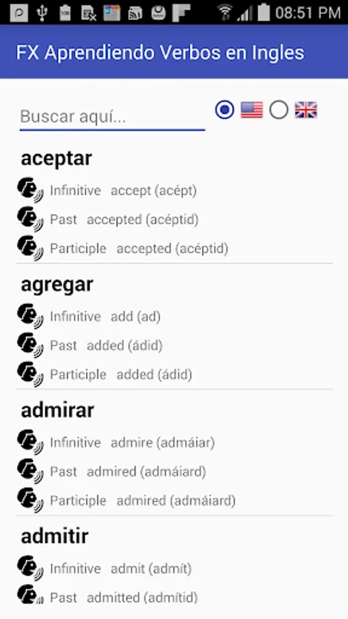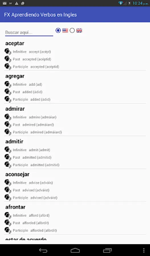 With FX verbs you can learn the verbs and tenses in English US / UK, download it and you can learn easily and simply pressing the verb and automatically have its translation and pronunciation, this application will improve your quality of life and understanding of the English language.