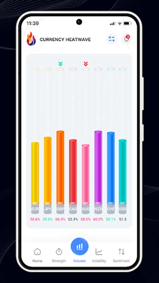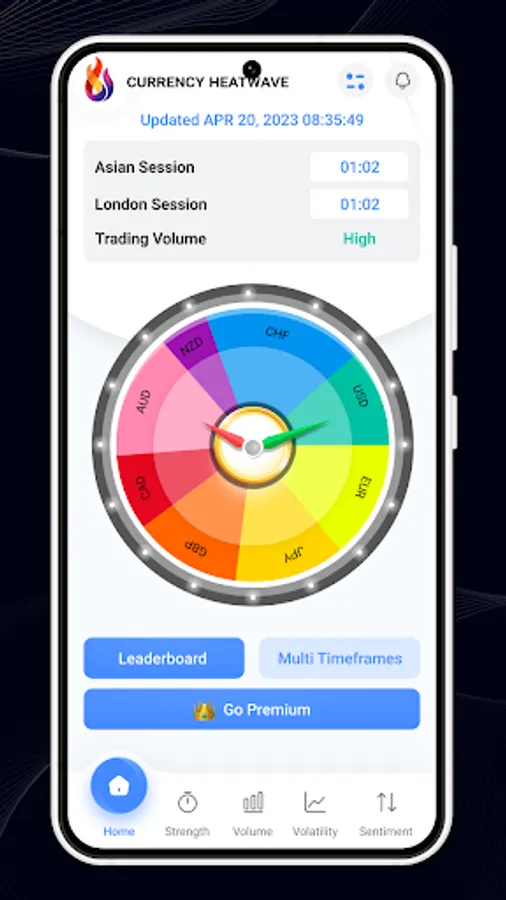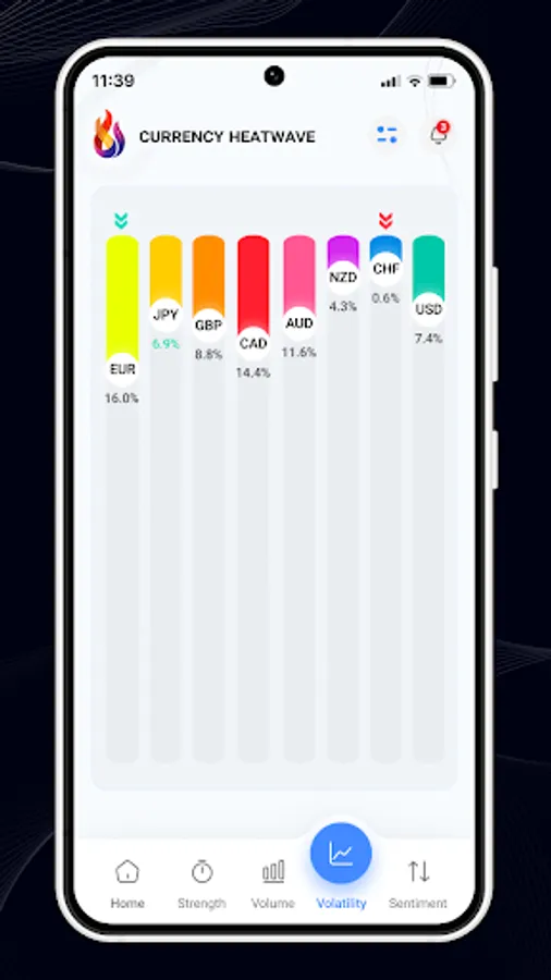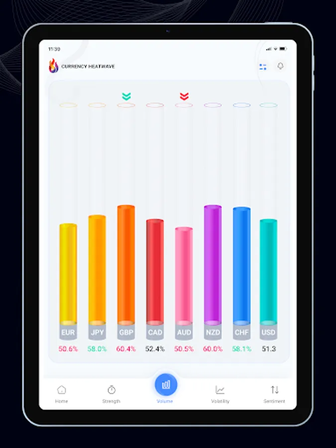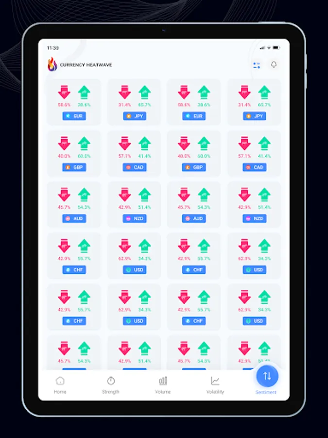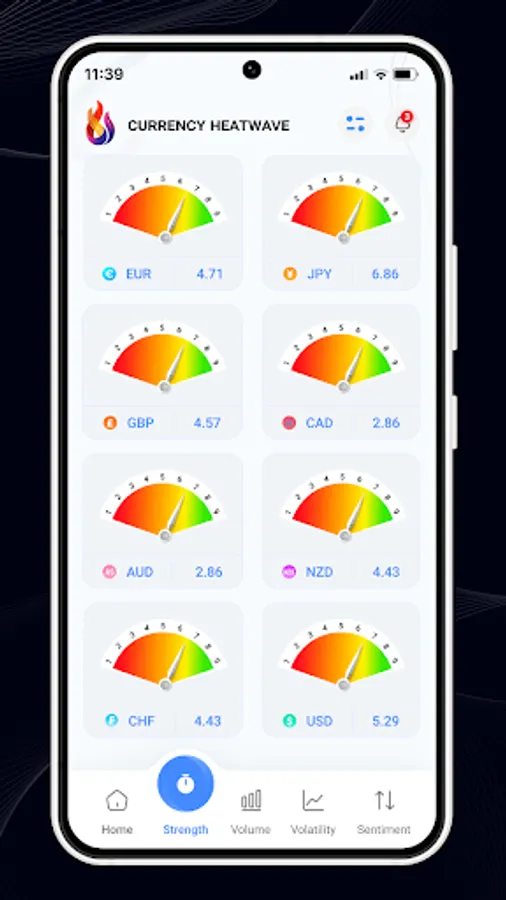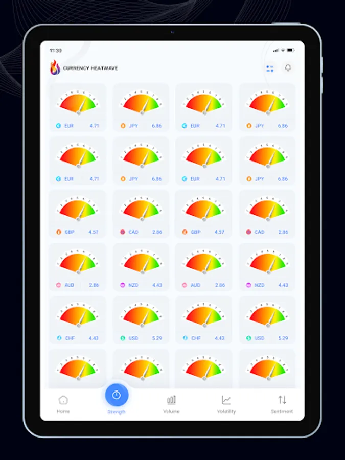 The currency strength meter app has 5 screens covering 4 important aspects of trading that is Currency Strength, Volume, Volatility and Sentiment.