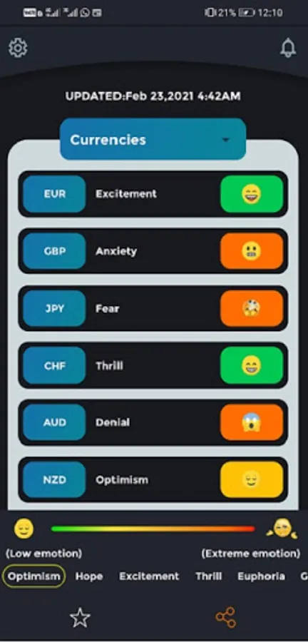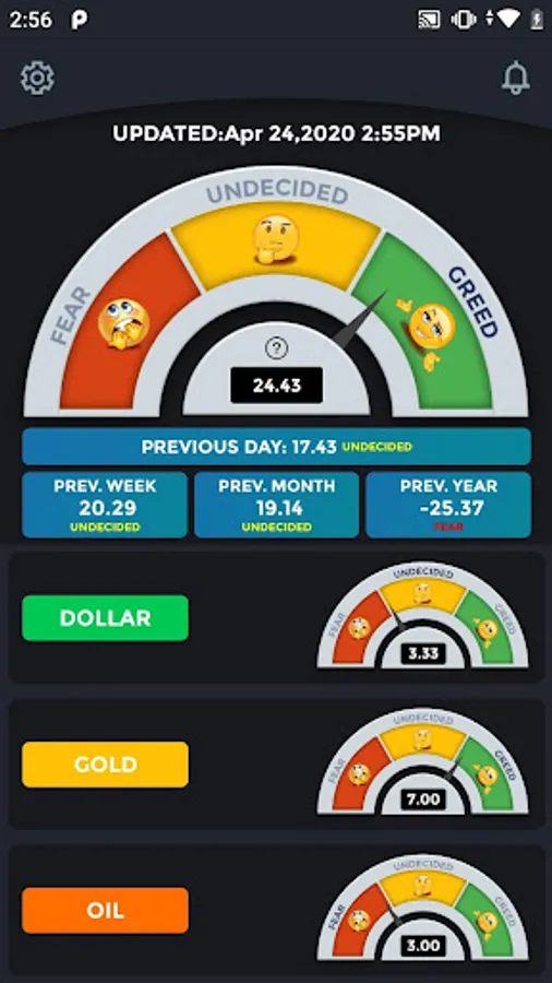 Fear and Greed relates to the volatility in the financial markets. This app takes into consideration all the performances of Currencies, commodities, Stocks and Bonds when determining the meter.