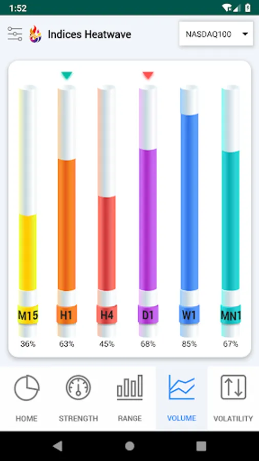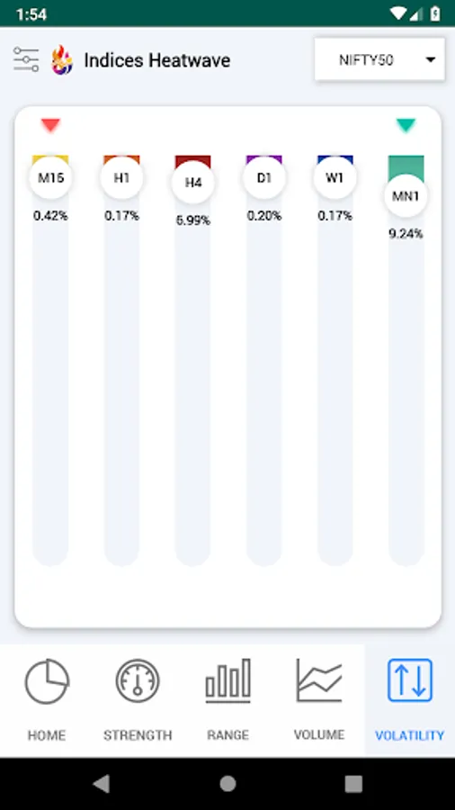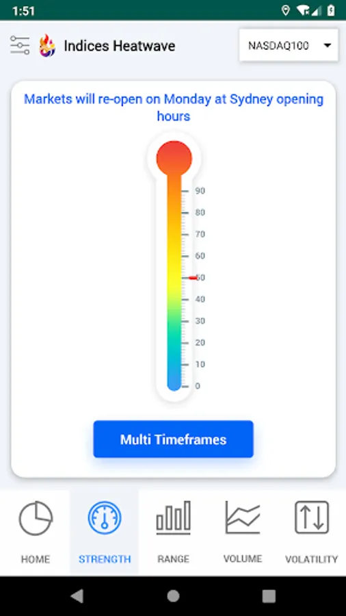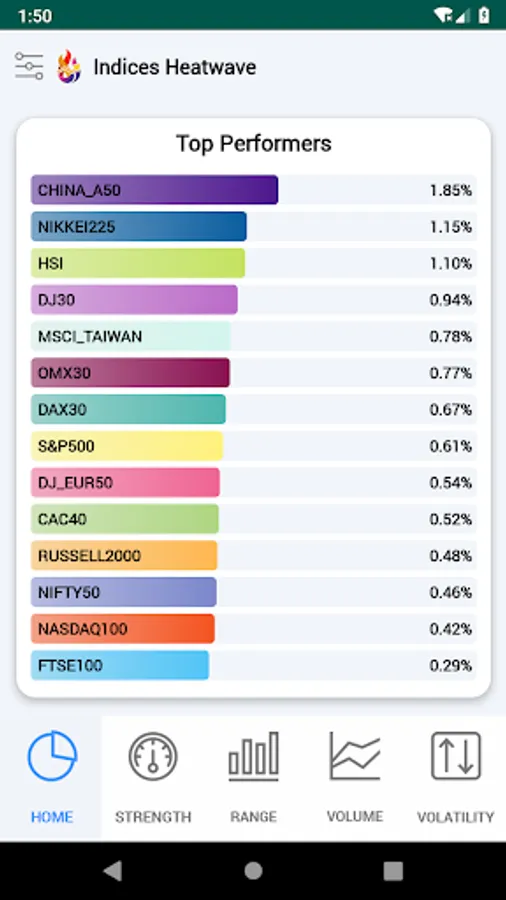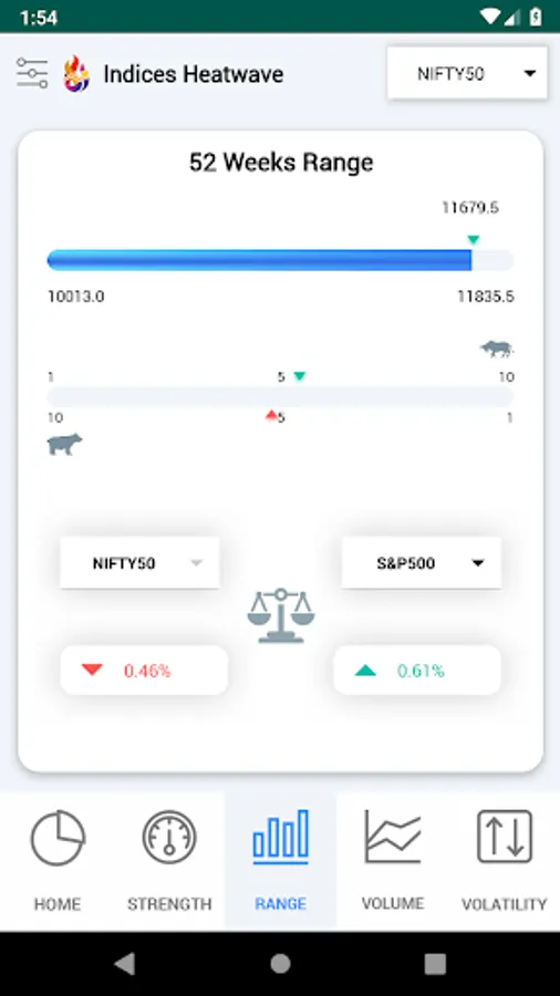 The Indexes performance meter app has 5 screens covering 4 important aspects of trading that is Indexes performance, Strength, Range, Volume and Volatility.